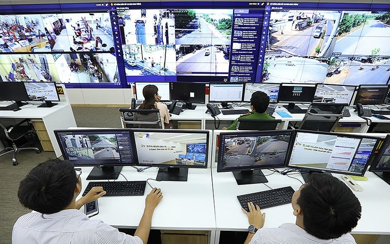 Hoạt động giám sát tại Trung tâm Điều hành và Giám sát thông minh tỉnh Bình Phước. (Ảnh: TTXVN)