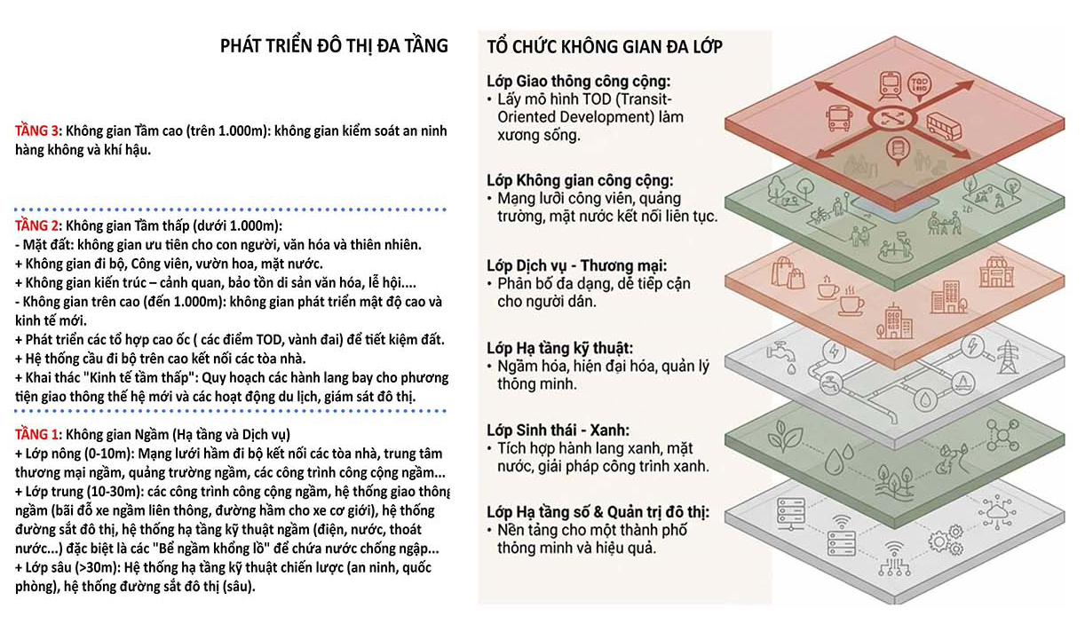 Theo ông Nghiêm, quy hoạch lần này đã chuyển từ tư duy không gian “tĩnh” sang không gian “động” và “mở”, có khả năng thích ứng linh hoạt trước biến động của thực tiễn. Trong đó, phát triển không gian đa tầng, bao gồm không gian ngầm, mặt đất và trên cao, là một nội dung quan trọng, góp phần tổ chức lại cấu trúc đô thị theo chiều sâu và nâng cao hiệu quả sử dụng đất.