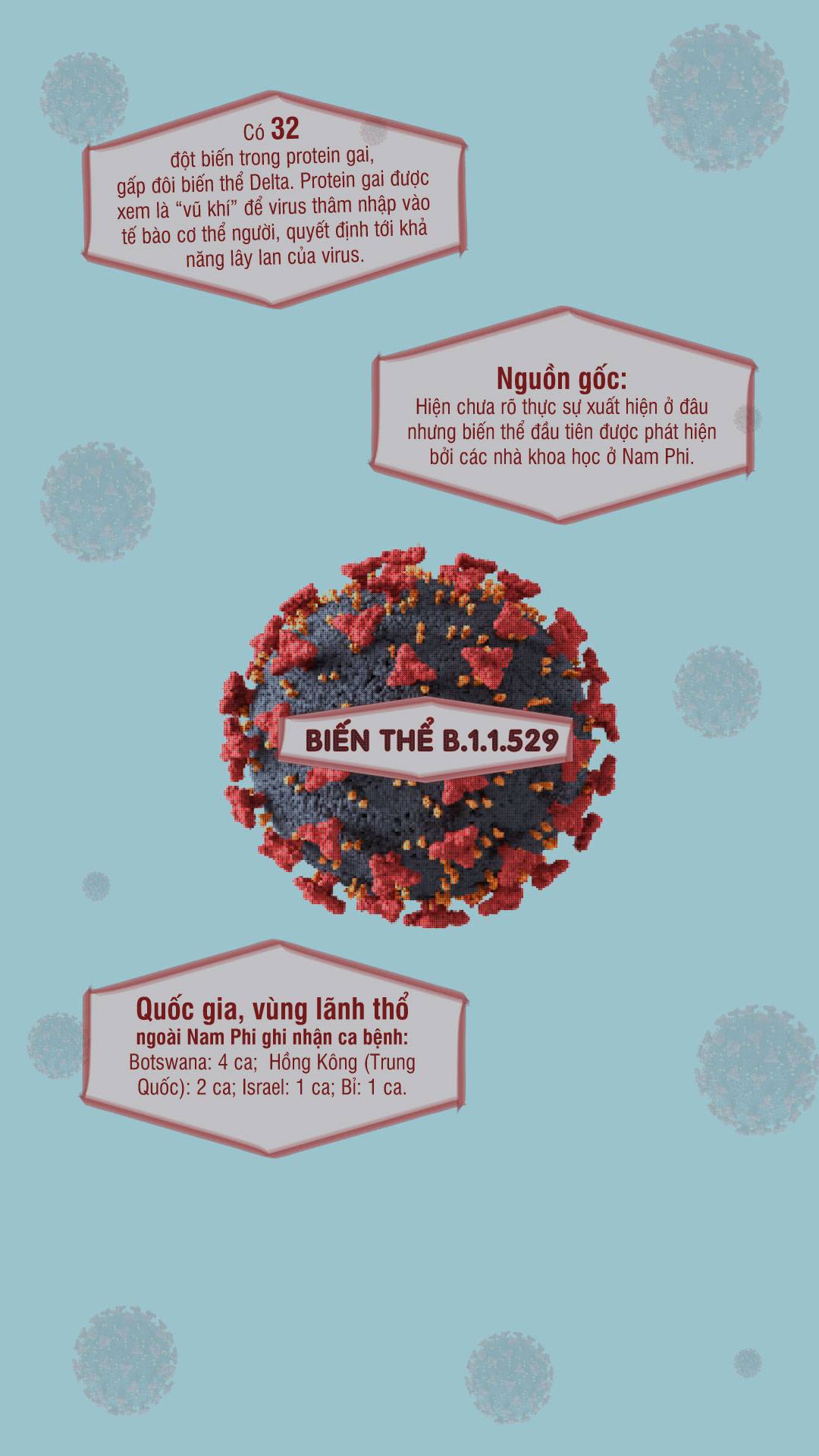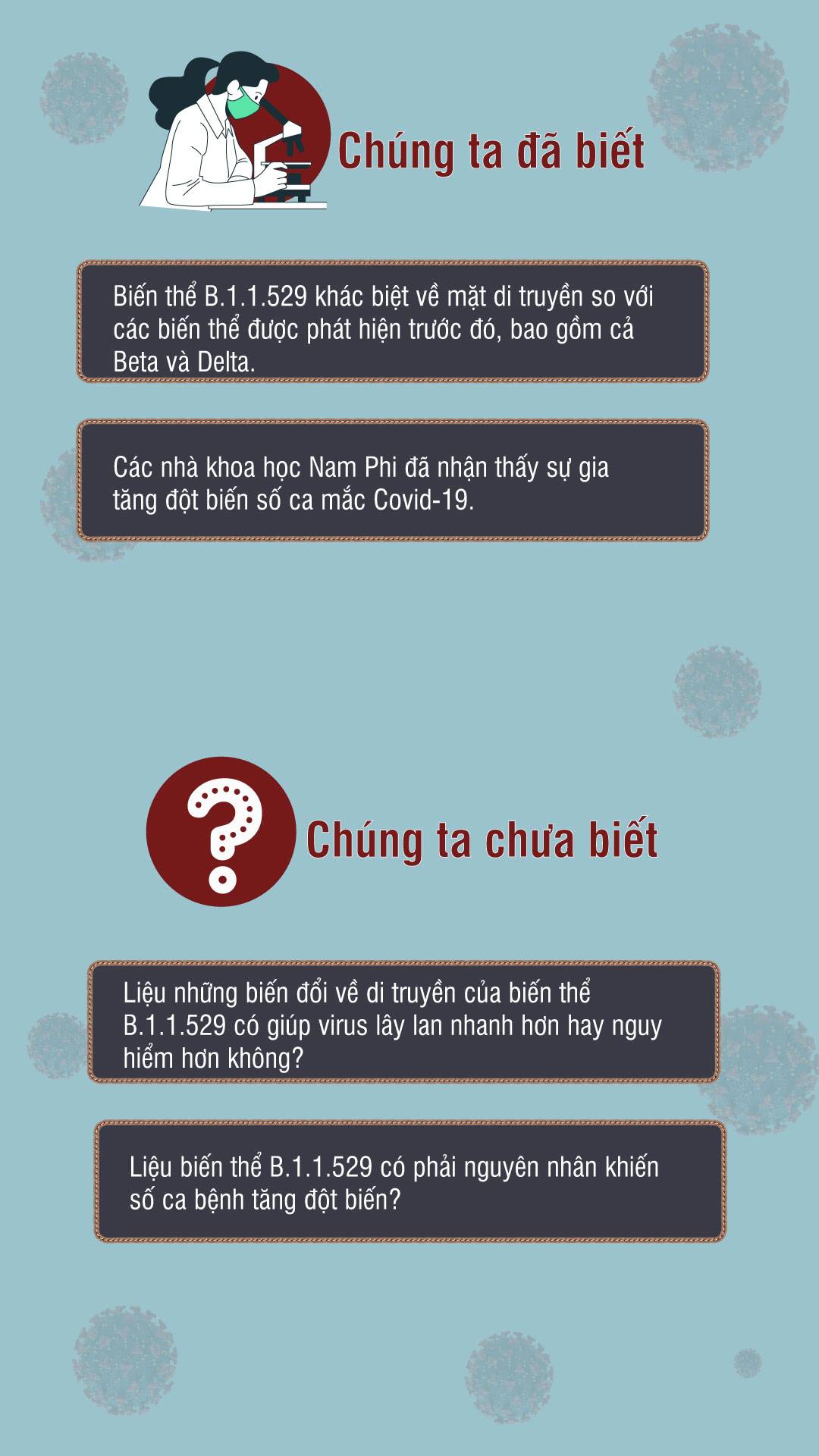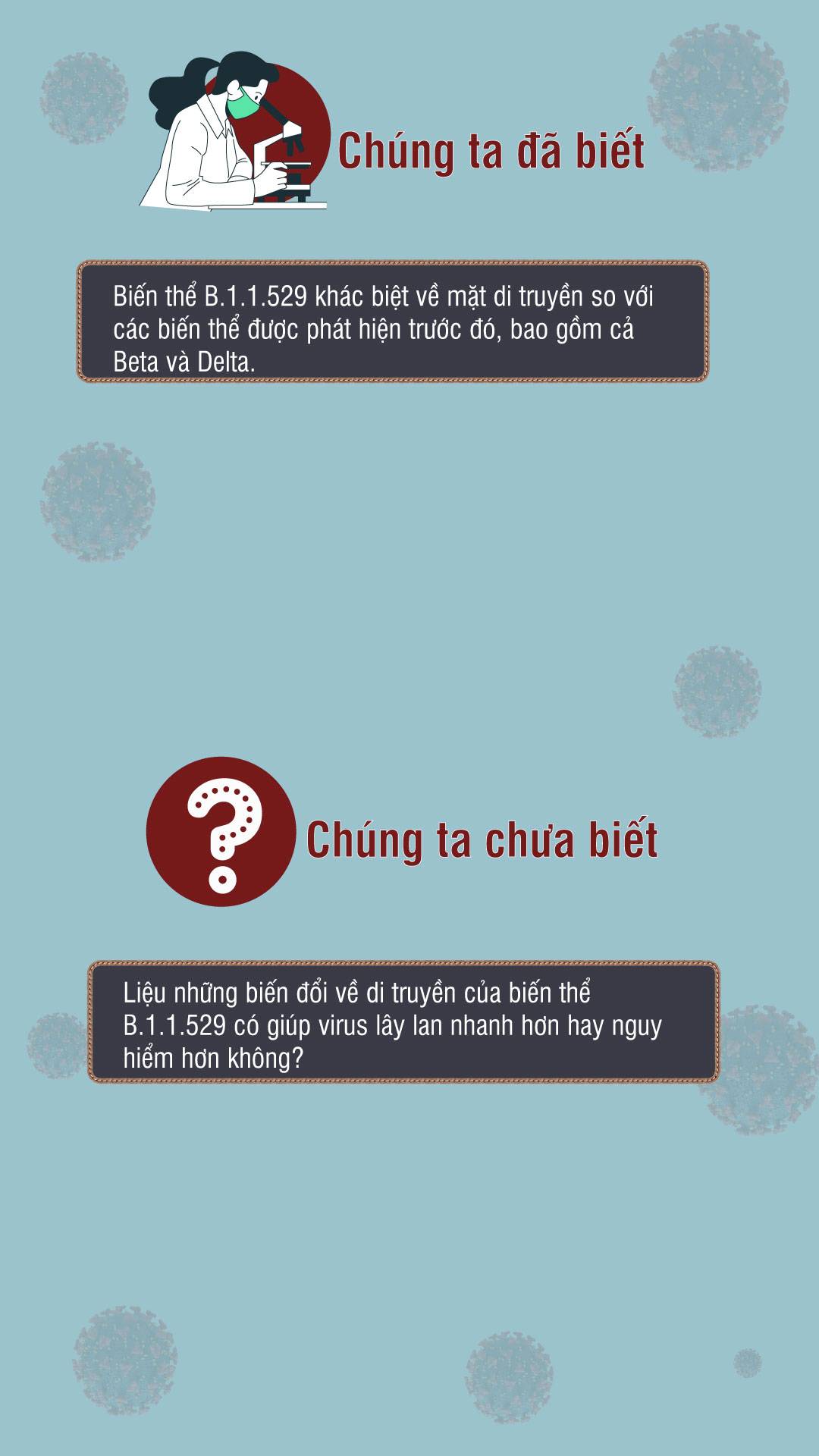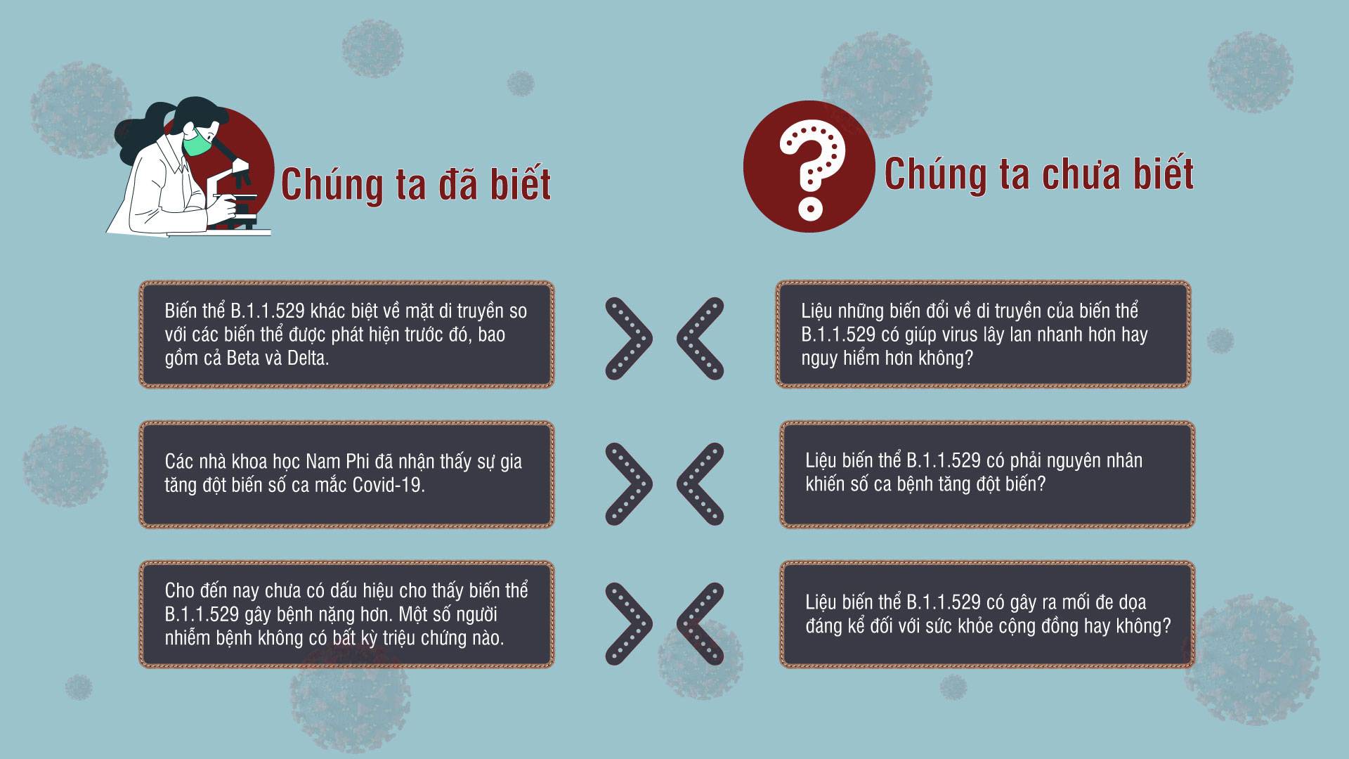 Theo các nhà khoa học, biến thể mới B.1.1.529 của virus SARS-CoV-2 có tới 32 đột biến trong protein gai, cao gấp 2 lần biến thể Delta và làm cho biến thể này về cơ bản khác với virus SARS-CoV-2 trước đó mà các vaccine phòng Covid-19 hiện tại được bào chế để chống lại. Đến thời điểm hiện tại, vẫn còn nhiều câu hỏi về biến thể này cần được các nhà khoa học giải đáp.