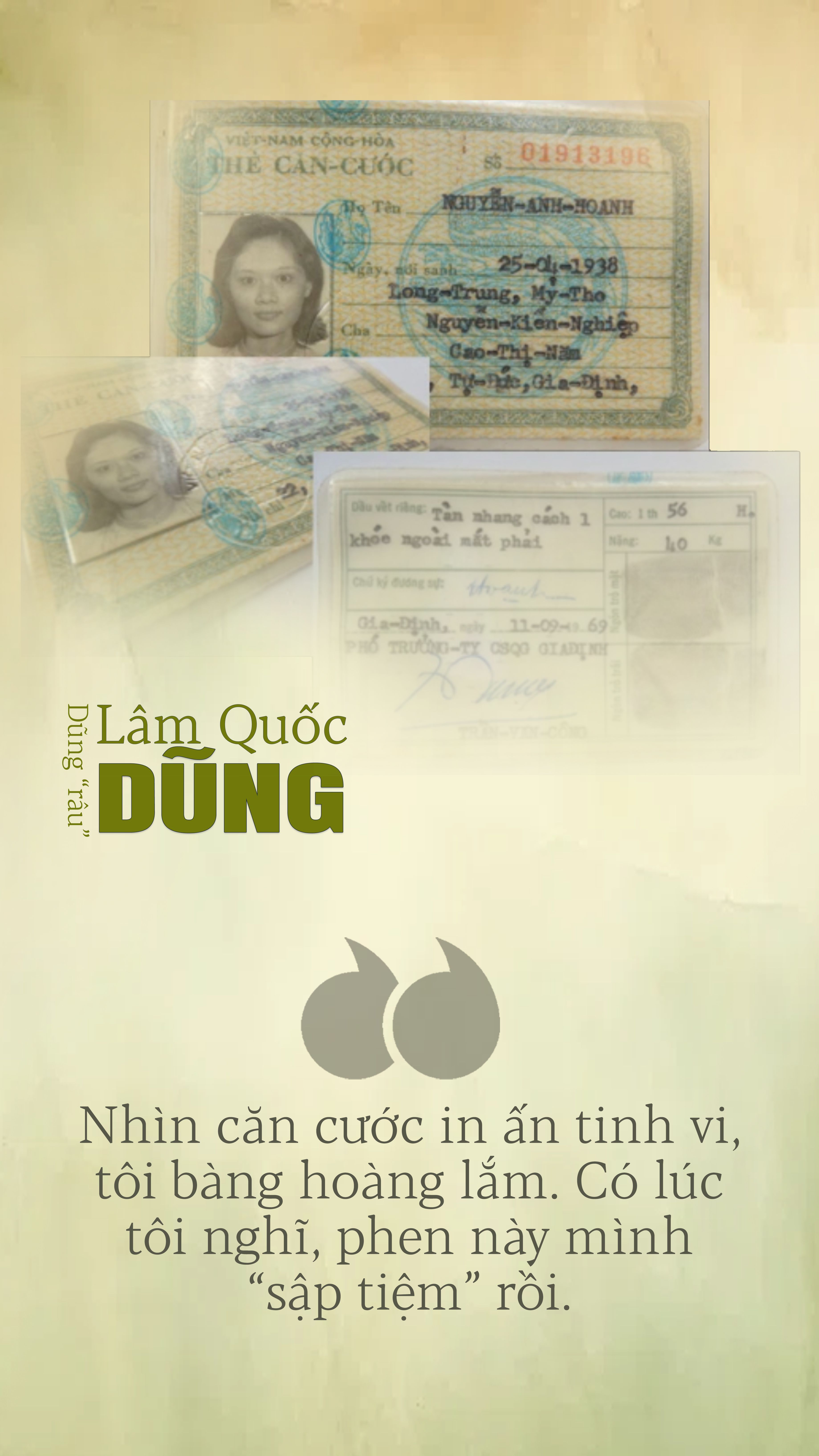 Để khắc phục tình trạng này, biết việc cấp căn cước mới còn mất nhiều thời gian, ông Lâm Quốc Dũng tiếp tục làm căn cước giả để anh chị em “lận lưng” ra vào Sài Gòn làm nhiệm vụ. Ngoài ra, ông cũng tinh vi làm giả được giấy biên nhận căn cước trong lúc chờ nhận căn cước mới. Tuy độ chính xác chỉ đạt hiệu quả 90% nhưng cũng qua mặt được cảnh sát. “Tôi được tặng thưởng Huân chương Chiến công nhờ sáng tạo này”, ông Dũng kể.
