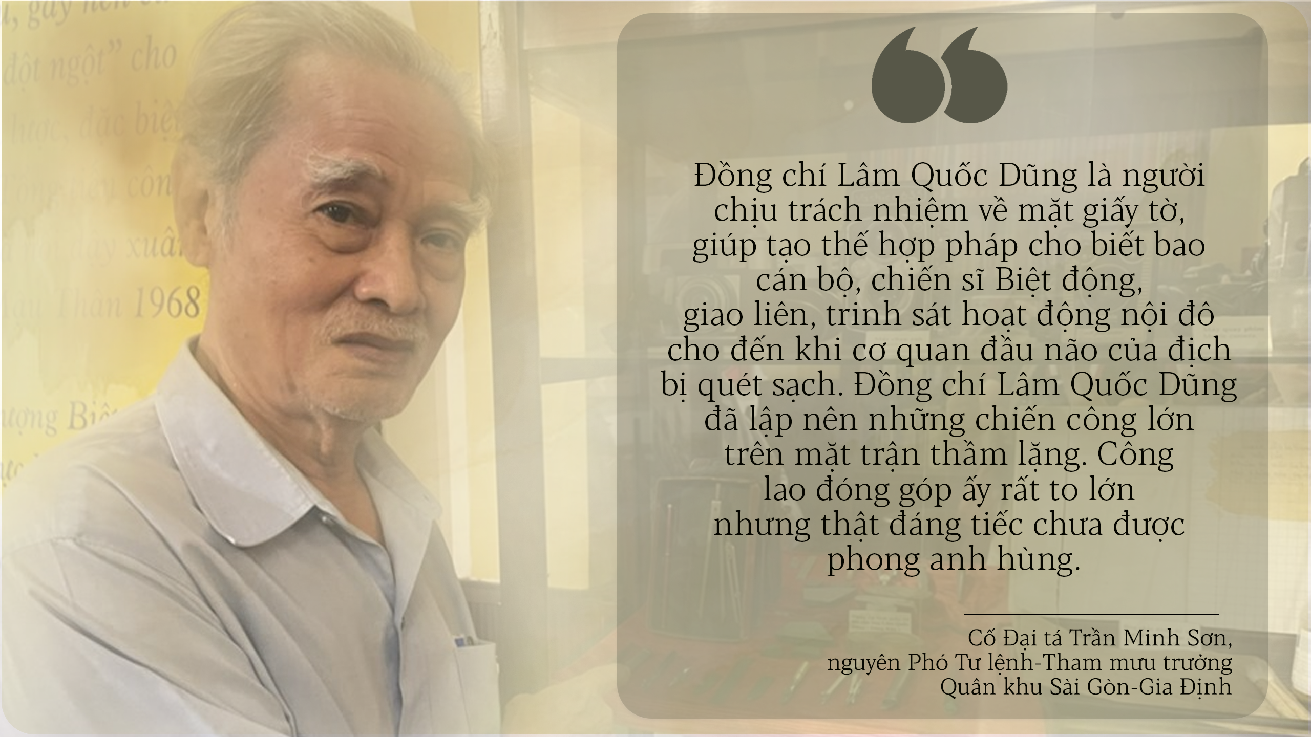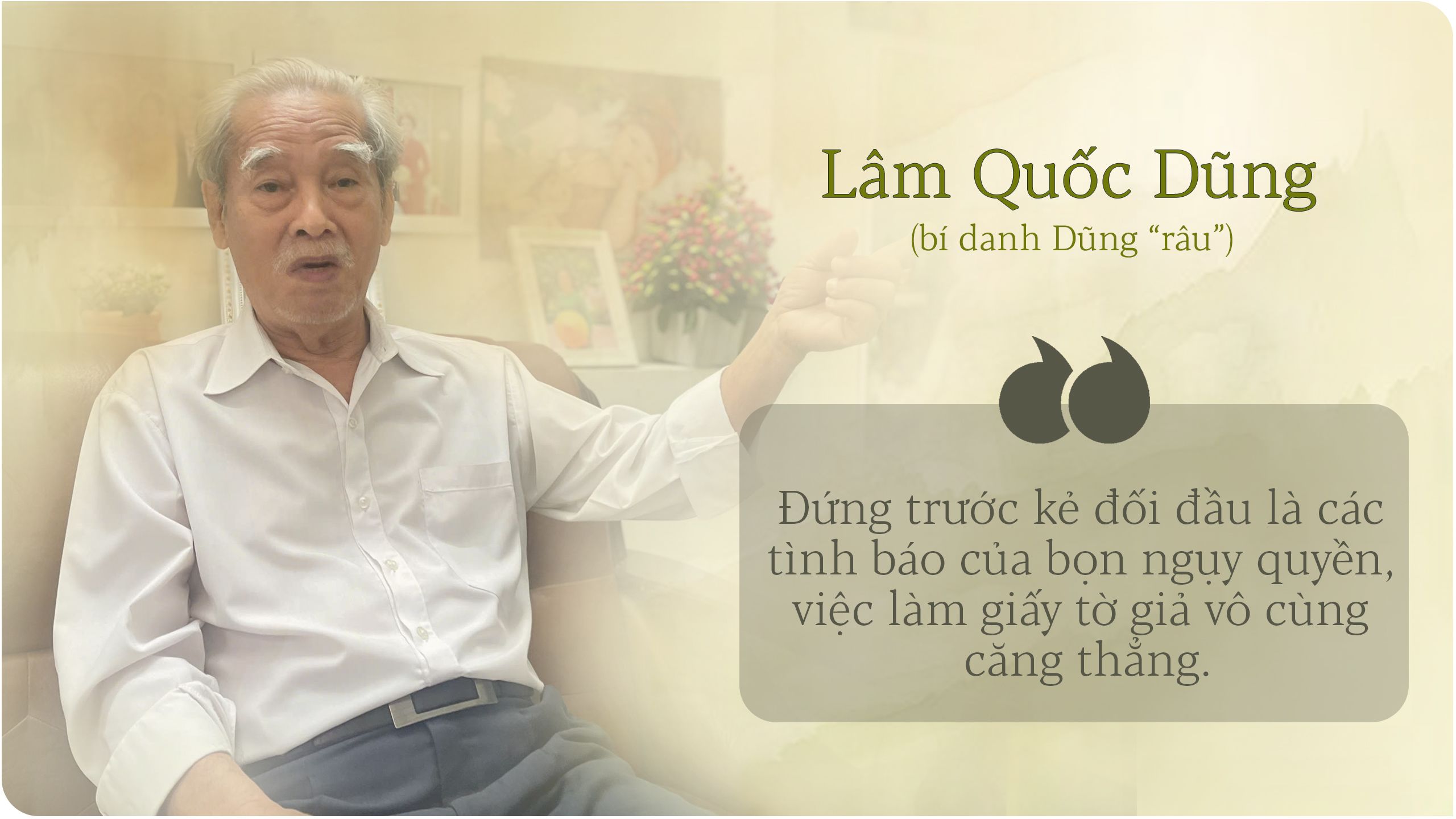 “Đứng trước kẻ đối đầu là các tình báo của bọn ngụy quyền, việc làm giấy tờ giả vô cùng căng thẳng. Đấy là điều nhắc nhở tôi phải làm với trách nhiệm cao nhất, dồn hết khả năng, tâm trí vào công việc để không đồng đội nào bị phát hiện ra mang giấy tờ giả, sa vào tay giặc”, ông Dũng nói.