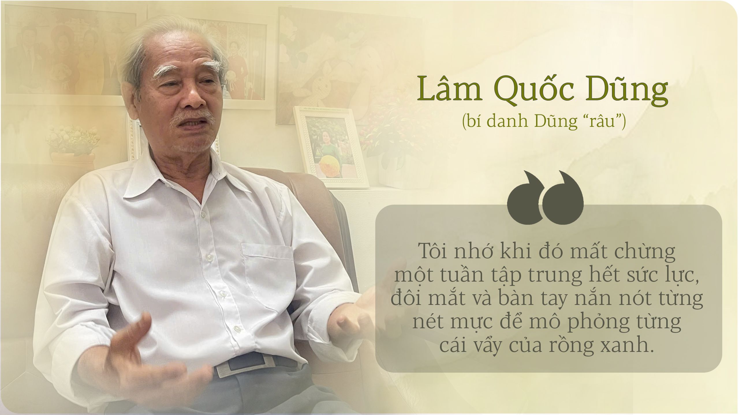 “Tôi nhớ khi đó mất chừng một tuần tập trung hết sức lực, đôi mắt và bàn tay nắn nót từng nét mực để mô phỏng từng cái vẩy của rồng xanh. Làm nhiều lần, tôi chọn được mẫu chính xác nhất để đưa cho thầy, đem đi in ấn”, ông Dũng kể.