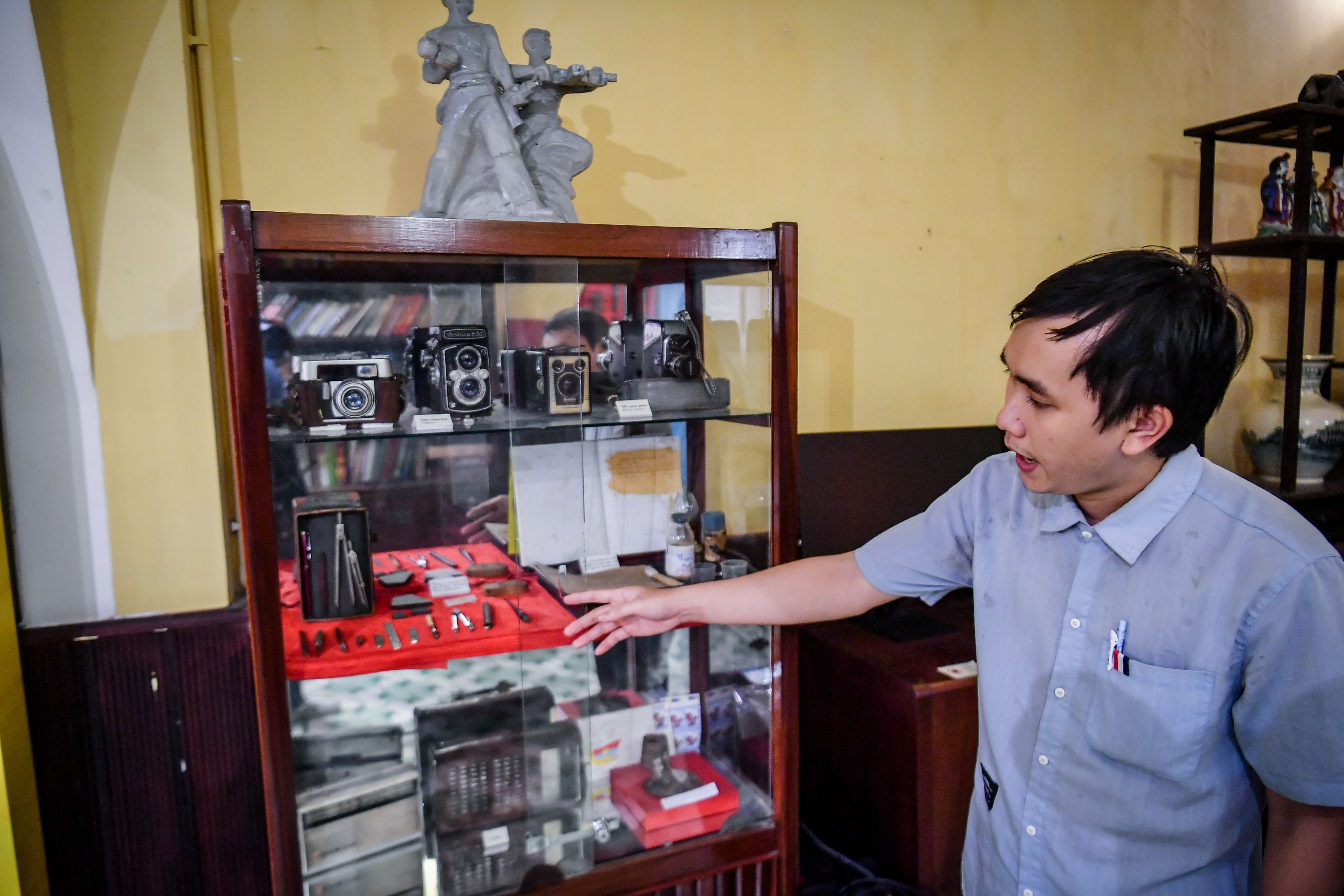 Cán bộ Bảo tàng biệt động Sài Gòn chỉ vào bộ công cụ làm giấy tờ giả do ông Dũng 'râu' tặng.