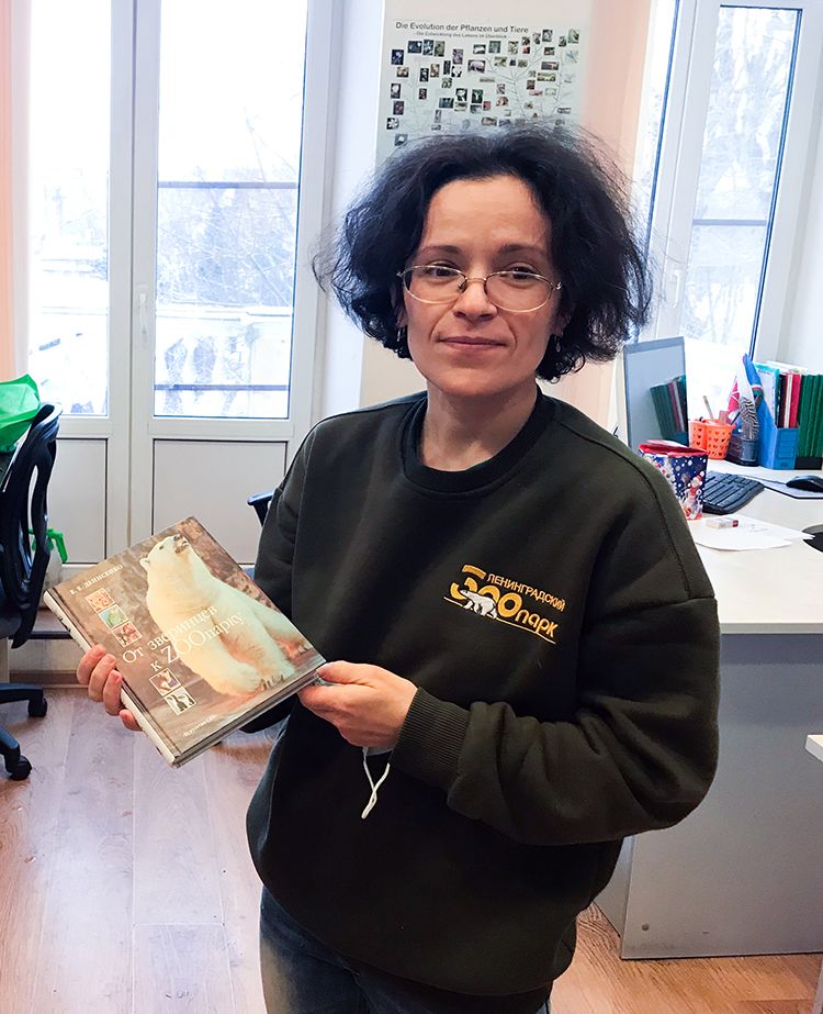 Bà S.Alexandrova cầm trên tay cuốn sách “Lịch sử vườn thú Leningrad” của tác giả E.E.Denisenko. (Ảnh: Thanh Thể)