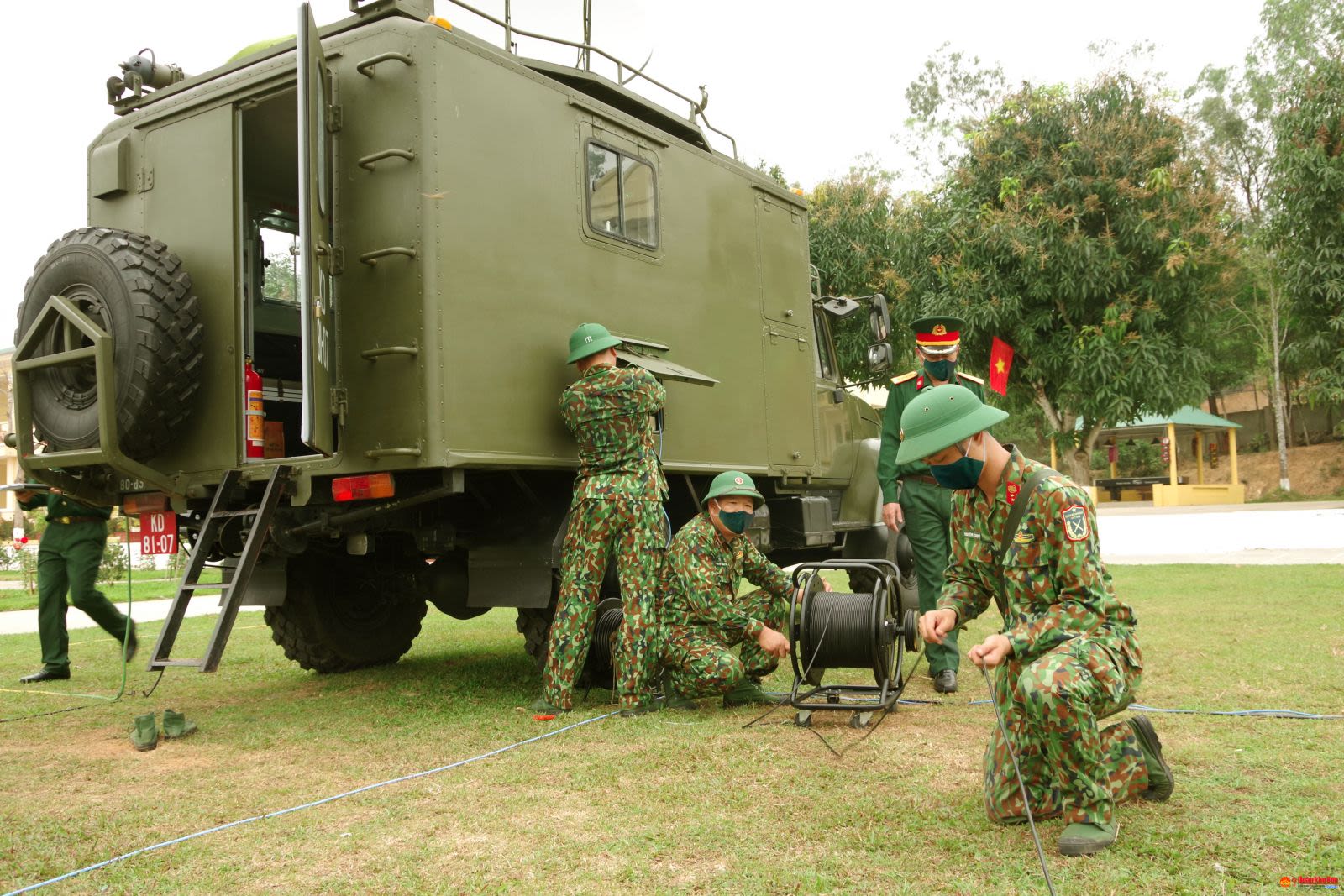Kiểm tra khả năng công tác bảo đảm thông tin tiên lạc, truyền hình xe tổng trạm thông tin cấp chiến dịch. (Ảnh: THNA)