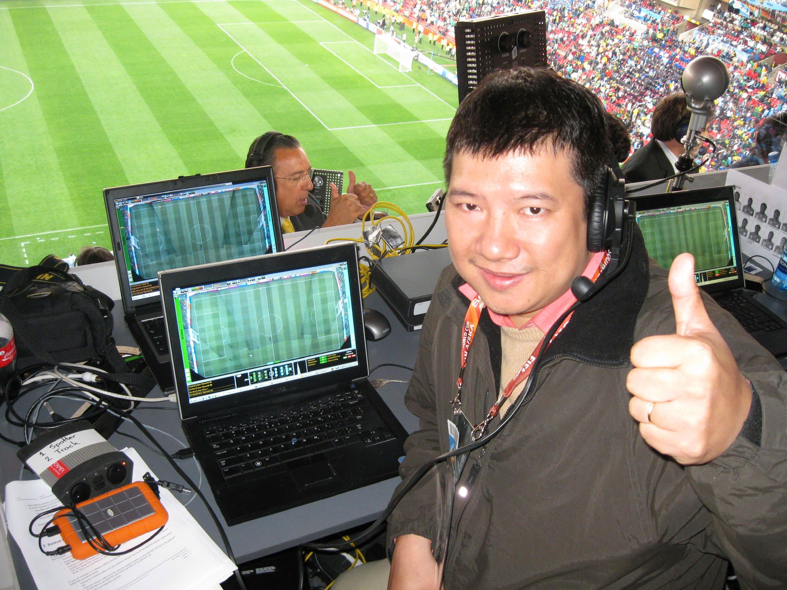 Bình luận viên Quang Huy tác nghiệp tại Phòng bình luận tại sân Mỹ Đình SEA Games 2003.
