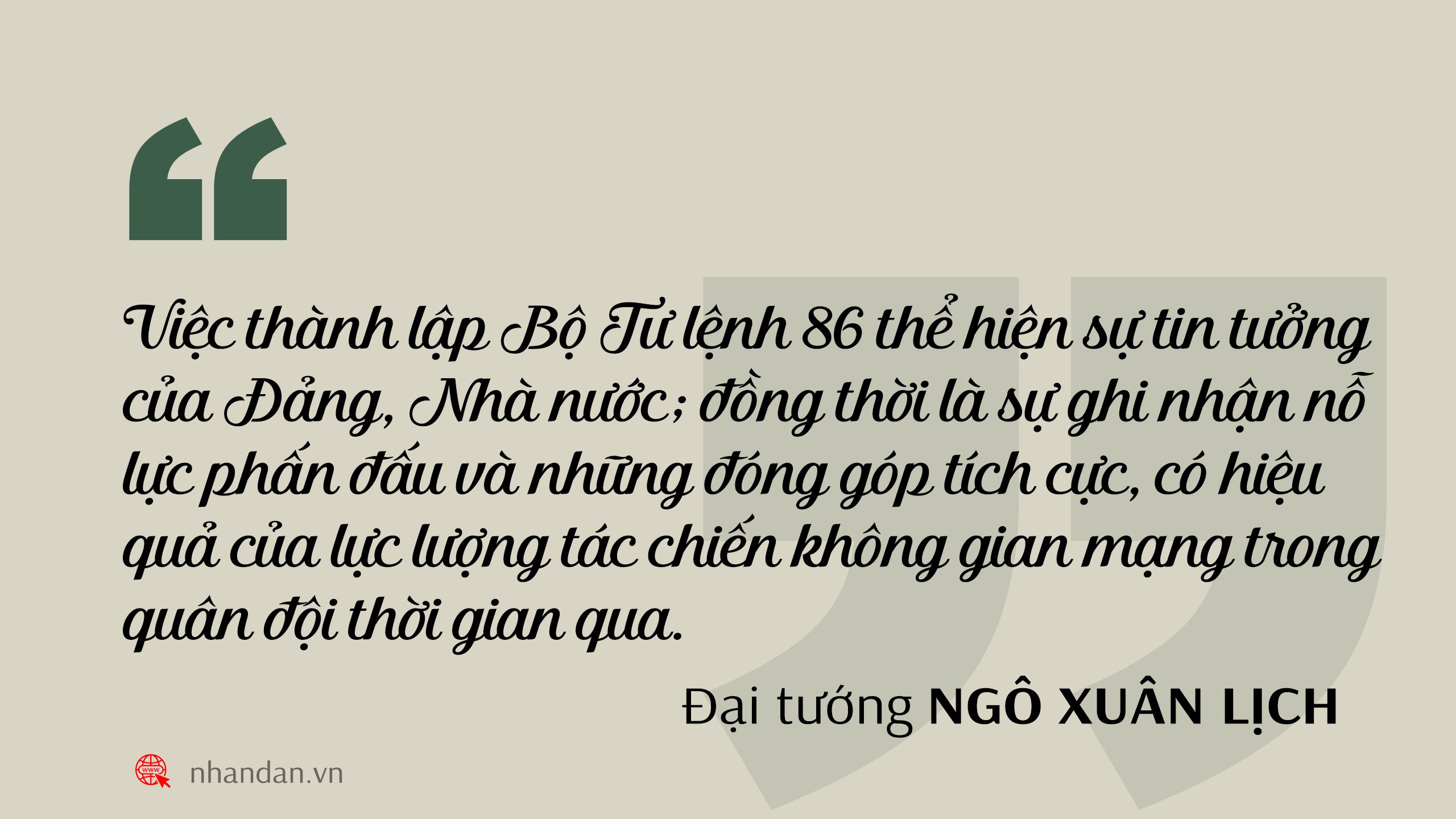 Phát biểu tại buổi lễ thành lập Bộ Tư lệnh Tác chiến không gian mạng, Đại tướng Ngô Xuân Lịch, Ủy viên Bộ Chính trị, Phó Bí thư Quân ủy Trung ương, Bộ trưởng Quốc phòng nêu rõ: Việc thành lập Bộ Tư lệnh 86 thể hiện sự tin tưởng của Đảng, Nhà nước; đồng thời là sự ghi nhận nỗ lực phấn đấu và những đóng góp tích cực, có hiệu quả của lực lượng tác chiến không gian mạng trong quân đội thời gian qua. Đây vừa là niềm vinh dự, tự hào, vừa là trách nhiệm cao cả của lực lượng tác chiến không gian mạng nói riêng và toàn quân nói chung trong sự nghiệp xây dựng và bảo vệ Tổ quốc trong thời gian tới.