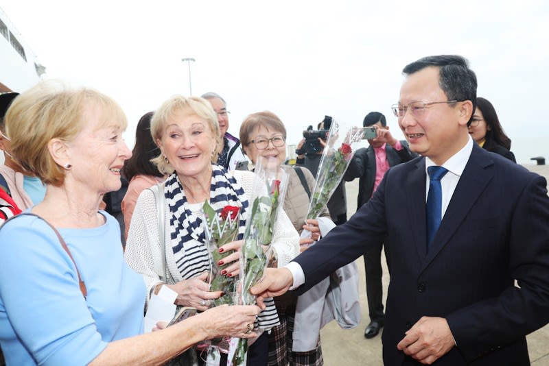 Quyền Chủ tịch Ủy ban nhân dân tỉnh Quảng Ninh Cao Tường Huy tặng hoa và chúc Tết các vị khách đầu tiên đến "xông đất" Quảng Ninh trong ngày đầu tiên của năm Quý Mão 2023. (Ảnh: QUANG THỌ)