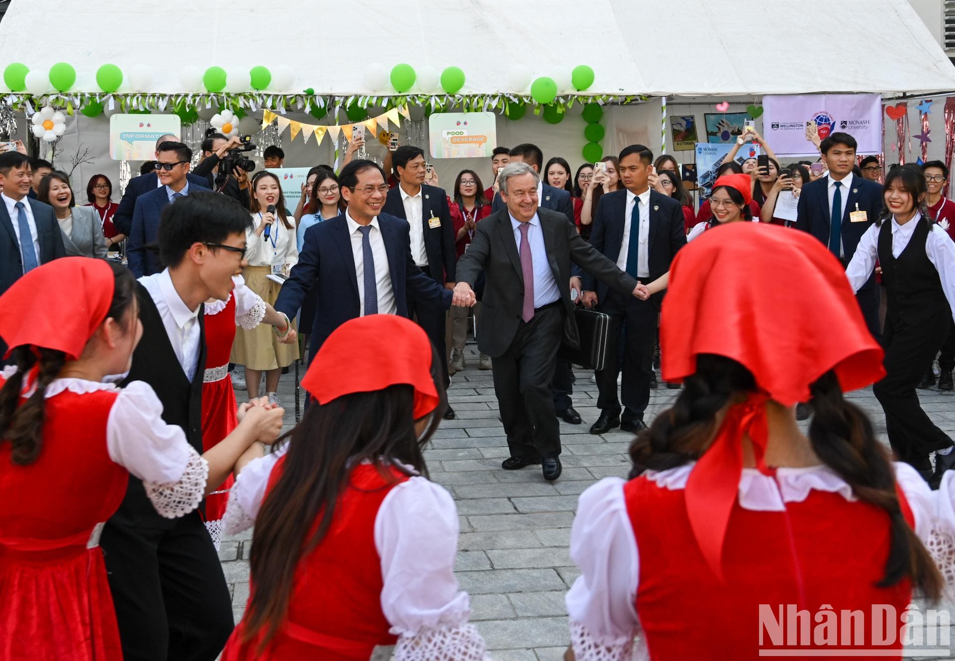 Tổng Thư ký Liên hợp quốc Antonio Guterres và Bộ trưởng Ngoại giao Bùi Thanh Sơn tham gia điệu nhảy sôi động cùng các sinh viên Học viện Ngoại giao. (Ảnh: DUY LINH)