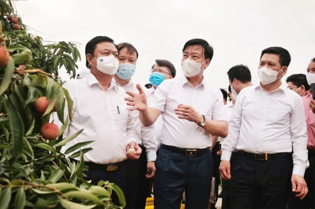 Bộ trưởng Nông nghiệp và Phát triển nông thôn Lê Minh Hoan và Bộ trưởng Công thương Nguyễn Hồng Diên thị sát vườn vải tại Hải Dương. Ảnh: Bộ Công thương