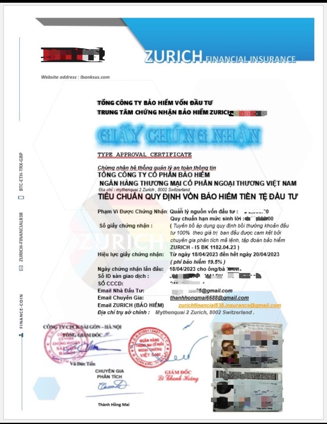 Cũng theo giấy chứng nhận này, tổ chức đứng ra ủy quyền bảo hiểm đầu tư có tên Zurich Financial Insurance có trụ sở tại… Thụy Sĩ.