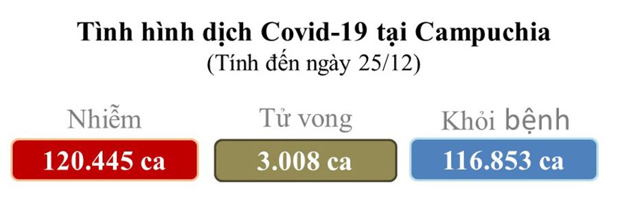 Ngày 25/12, Campuchia xác nhận có 1 bệnh nhân tử vong do Covid-19, 5 ca nhiễm mới và thêm 8 bệnh nhân phục hồi.