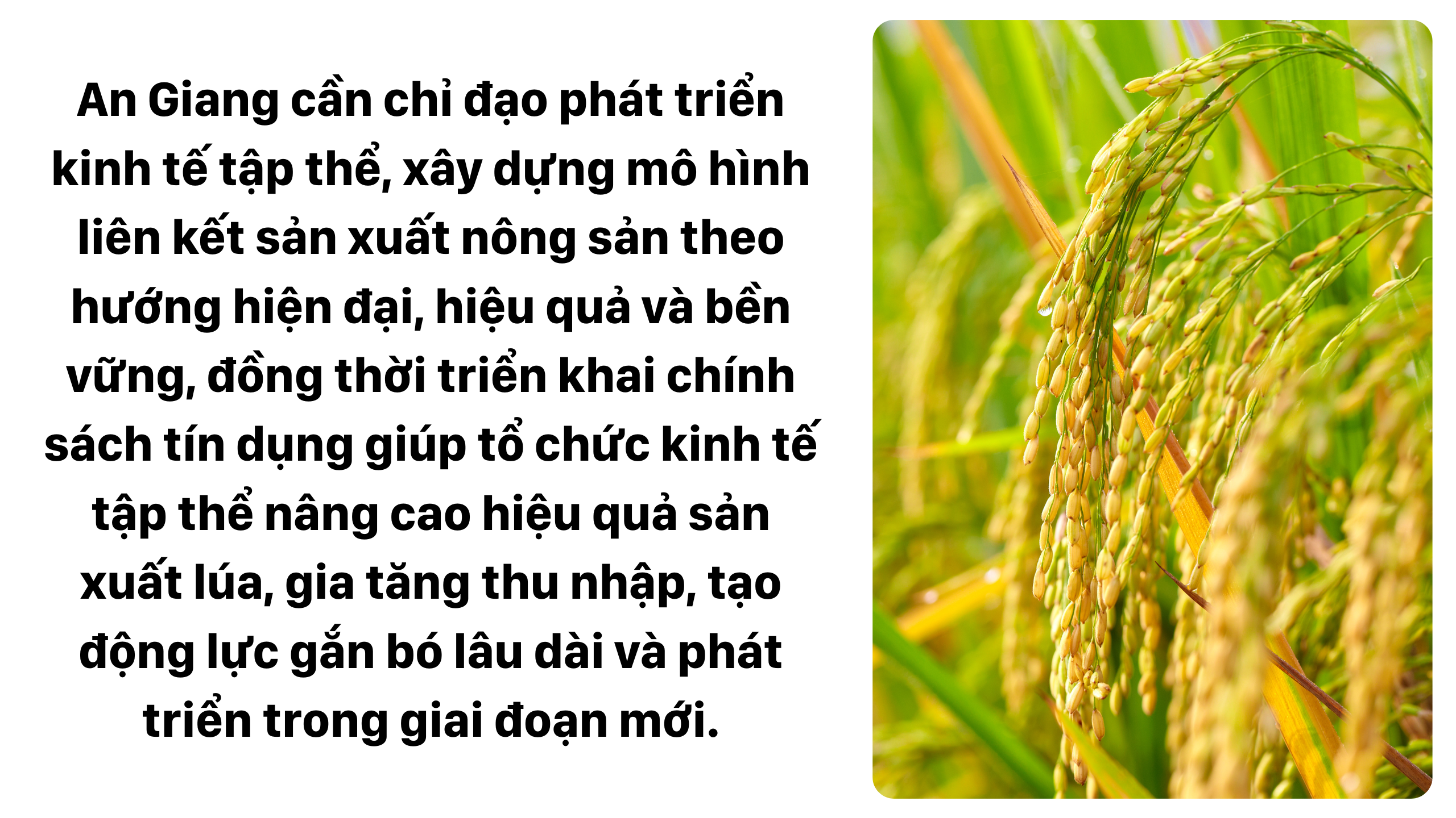 "Bên cạnh đó, cần triển khai chính sách tín dụng phù hợp năng lực và điều kiện thực tế của hợp tác xã, tổ hợp tác giúp tổ chức kinh tế tập thể nâng cao hiệu quả sản xuất lúa, gia tăng thu nhập, tạo động lực gắn bó lâu dài và phát triển trong giai đoạn mới. Thực hiện bồi dưỡng kiến thức về thị trường, chuyển đổi số,… nhằm nâng cao hiệu quả hoạt động và khả năng thích ứng trong bối cảnh mới", ông Trần Thanh Hiệp nhấn mạnh.