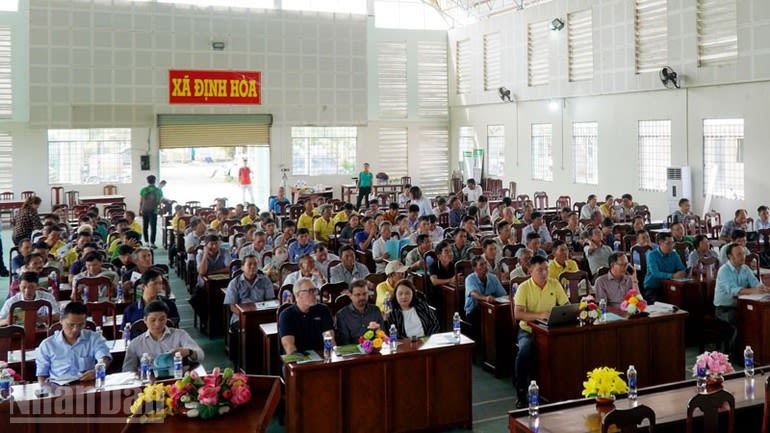 Nông dân xã Định Hòa tham dự buổi đánh giá mô hình canh tác lúa giảm phát thải phục vụ phát triển bền vững vùng nguyên liệu lúa gạo xuất khẩu của Đồng bằng sông Cửu Long.