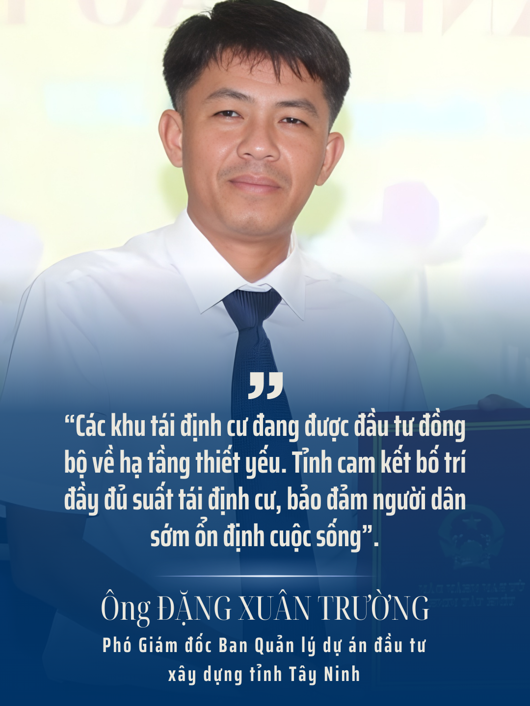 Ban quản lý Dự án đầu tư xây dựng tỉnh Tây Ninh cũng cho biết: các phường, xã cam kết bảo đảm công tác bố trí đầy đủ suất tái định cư tại các khu tái định cư cho các hộ dân. Các khu tái định cư đang được đầu tư cơ sở hạ tầng thiết yếu để sớm bàn giao cho người dân.