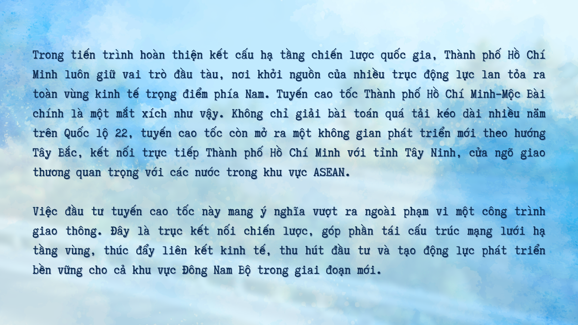 Cao tốc Thành phố Hồ Chí Minh–Mộc Bài không chỉ là một tuyến đường mới, mà là đòn bẩy chiến lược để mở rộng không gian phát triển của Thành phố Hồ Chí Minh và vùng Đông Nam Bộ. Khi trục cao tốc này được hình thành, liên kết vùng sẽ được tăng cường, cửa ngõ Tây Bắc của Thành phố Hồ Chí Minh sẽ được khai thông, tạo thêm động lực thu hút đầu tư và hội nhập quốc tế.