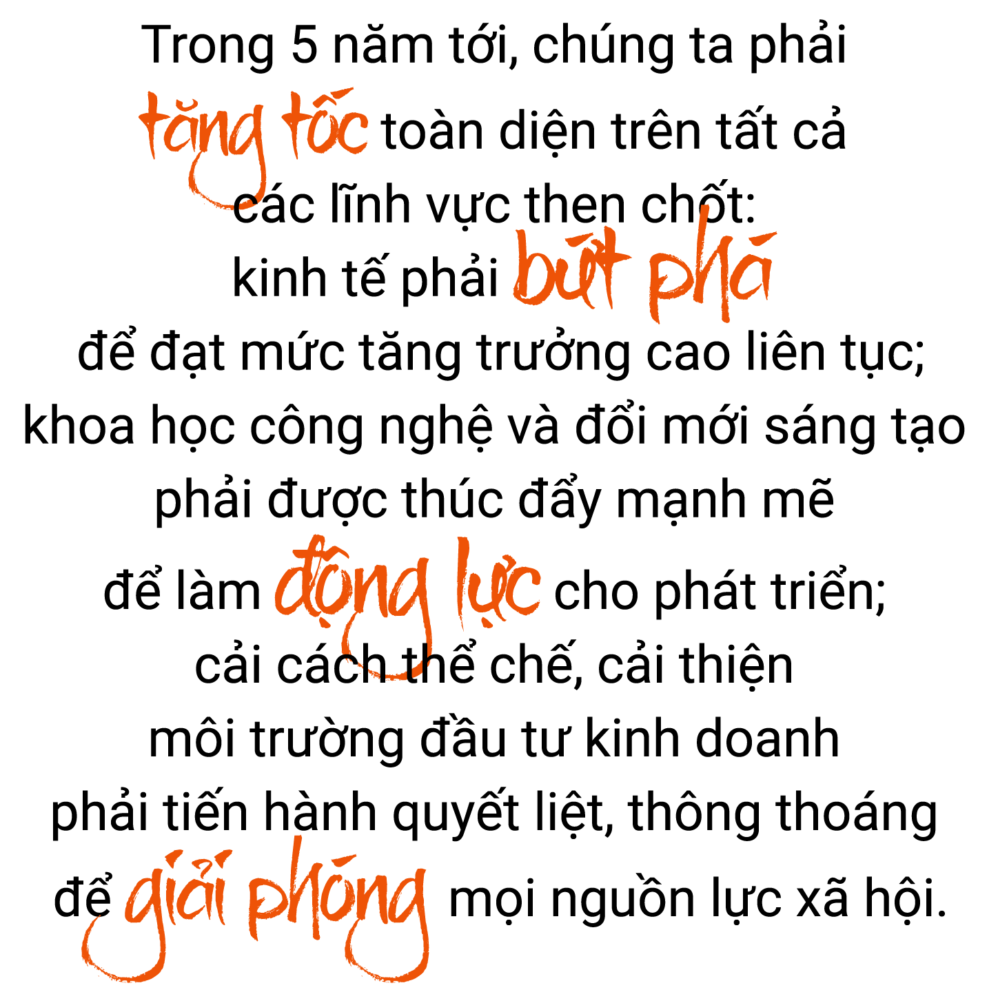 "Khoa học, công nghệ, đổi mới sáng tạo và chuyển đổi số phải thực sự trở thành động lực then chốt của tăng trưởng; là nền tảng nâng cao năng suất và năng lực cạnh tranh; là công cụ nâng cao hiệu quả quản trị, năng lực tự chủ quốc gia, bảo đảm quốc phòng, an ninh; là phương thức để tạo ra các mô hình kinh doanh mới, việc làm mới, giá trị gia tăng mới."