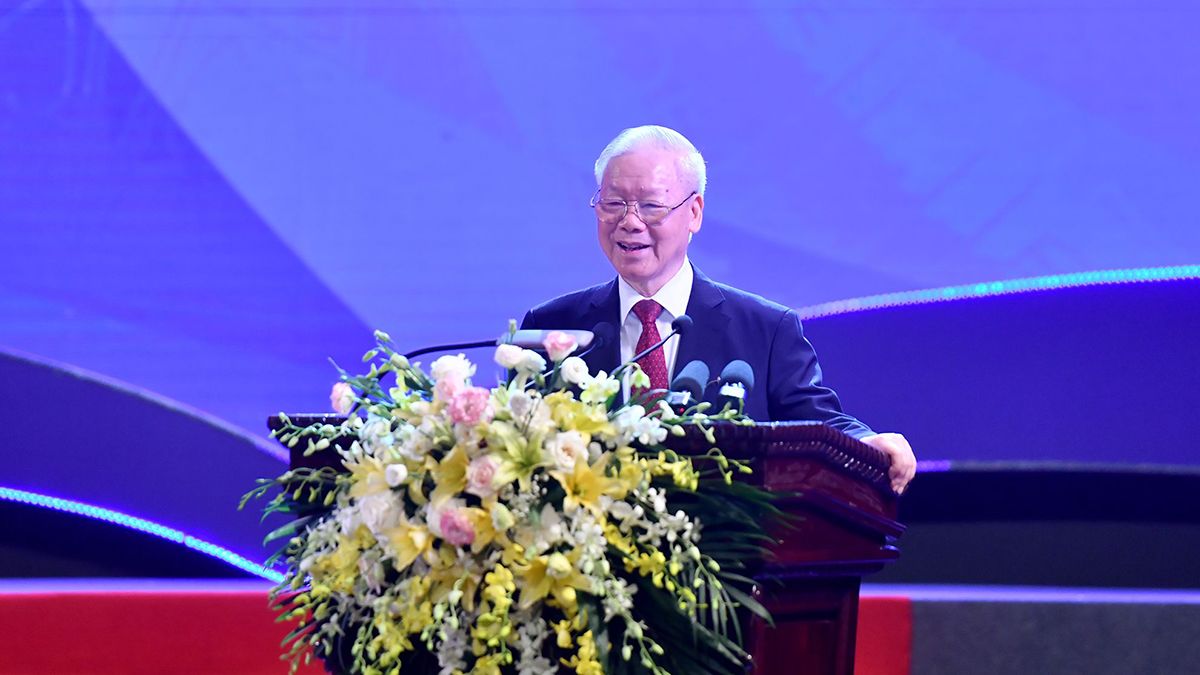 Tổng Bí thư Nguyễn Phú Trọng phát biểu tại Lễ kỷ niệm 75 năm Ngày thành lập Liên hiệp các Hội Văn học nghệ thuật Việt Nam. Ảnh: ĐĂNG KHOA