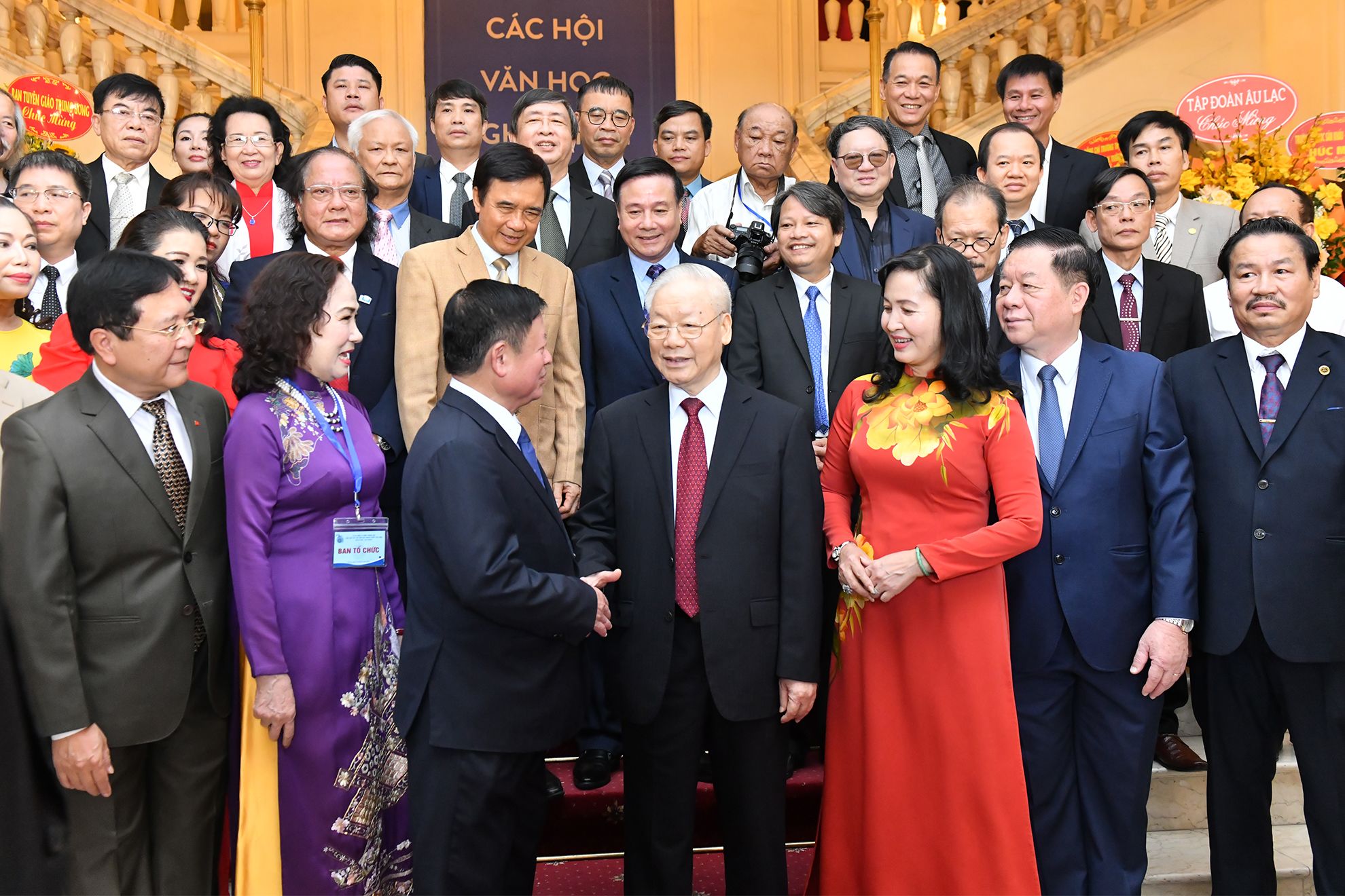 Tổng Bí thư Nguyễn Phú Trọng và các đại biểu dự Lễ kỷ niệm 75 năm Ngày thành lập Liên hiệp các Hội VHNT Việt Nam. Ảnh: ĐĂNG KHOA