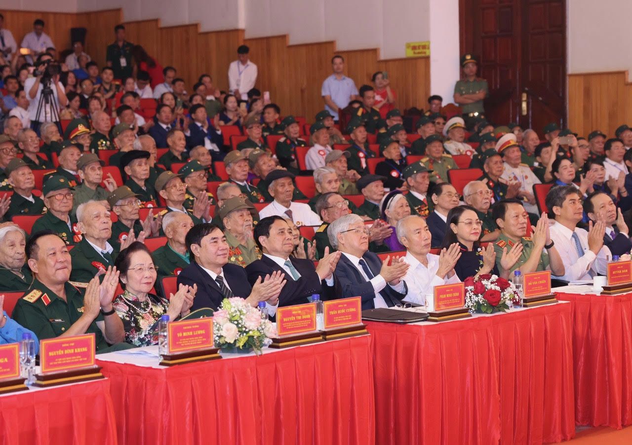 Và ngày hôm nay, chúng ta bồi hồi, xúc động được gặp lại những tấm gương, hình ảnh ấy, cảm nhận tinh thần hăng hái, phấn khởi ấy từ 139 đại biểu đại diện chiến sĩ Điện Biên, thanh niên xung phong, dân công hỏa tuyến có mặt tại đây - đại diện cho những người con ưu tú của đất nước đã cống hiến sức lực, máu thịt của mình để làm nên Chiến thắng Điện Biên Phủ - một trong những đỉnh cao chói lọi, kỳ tích vẻ vang và “cột mốc vàng” trong lịch sử đấu tranh chống ngoại xâm của dân tộc ta; xứng đáng được ghi vào lịch sử như một Bạch Đằng, Chi Lăng, Đống Đa trong thời đại Hồ Chí Minh.