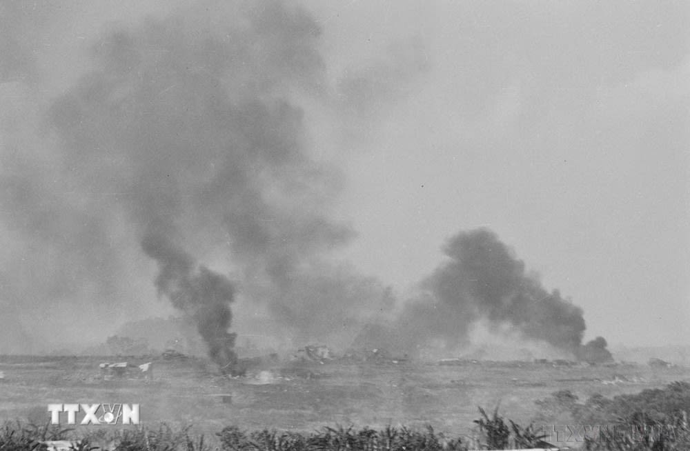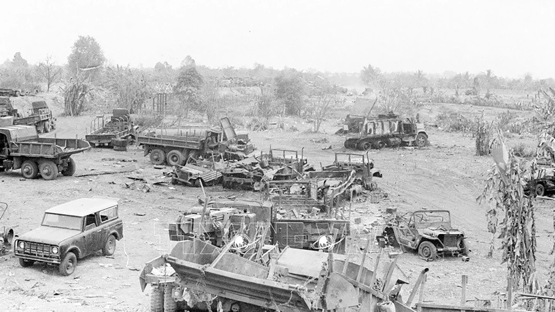 Quân giải phóng chặn đánh và phá hủy phương tiện của lính ngụy thuộc Quân đoàn 2 rút chạy trên đường số 7 từ Cheo Reo đi Phú Bổn. (Ảnh: TTXVN)