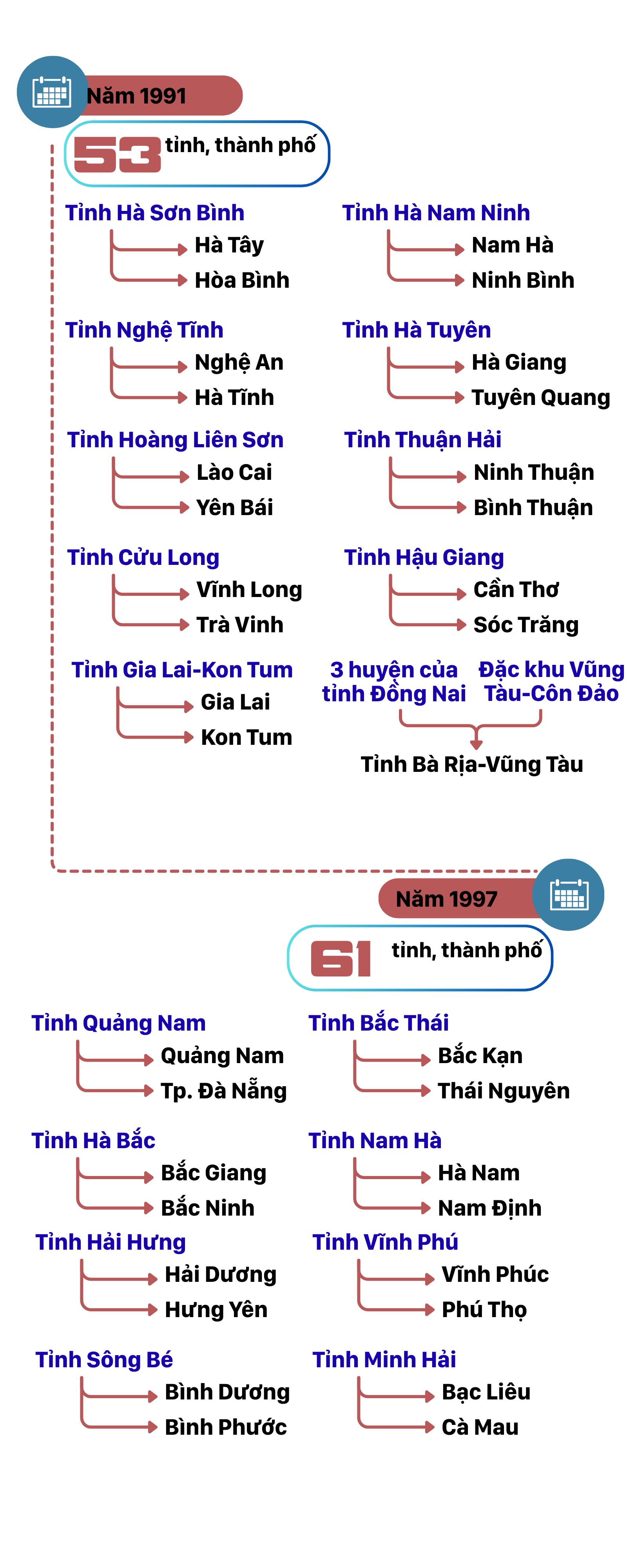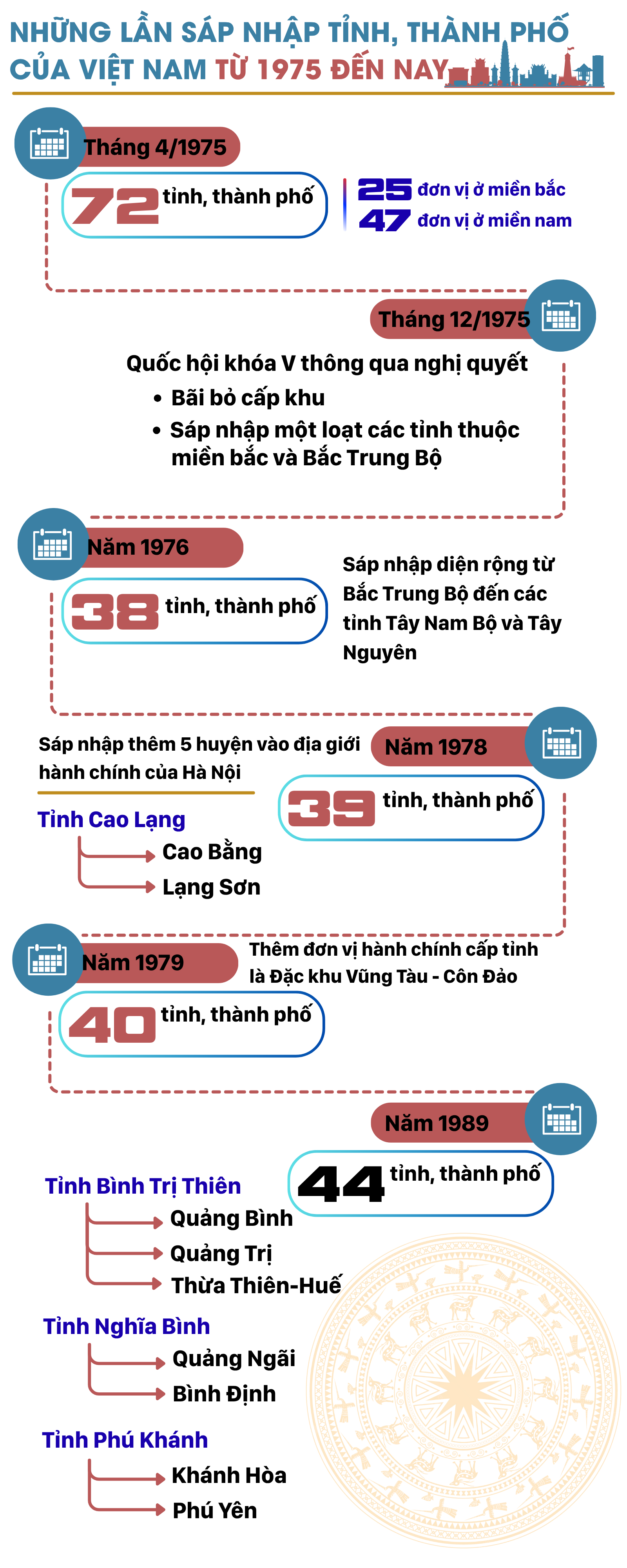 Sau khi thống nhất đất nước vào tháng 4/1975, Việt Nam có 72 đơn vị hành chính cấp tỉnh (miền bắc có 25 đơn vị và miền nam có 47 đơn vị). Vào tháng 12/1975, Quốc hội ra nghị quyết bãi bỏ cấp khu, giải thể khu tự trị, hợp nhất đơn vị hành chính, sáp nhập hàng loạt tỉnh phía bắc và Bắc Trung Bộ.