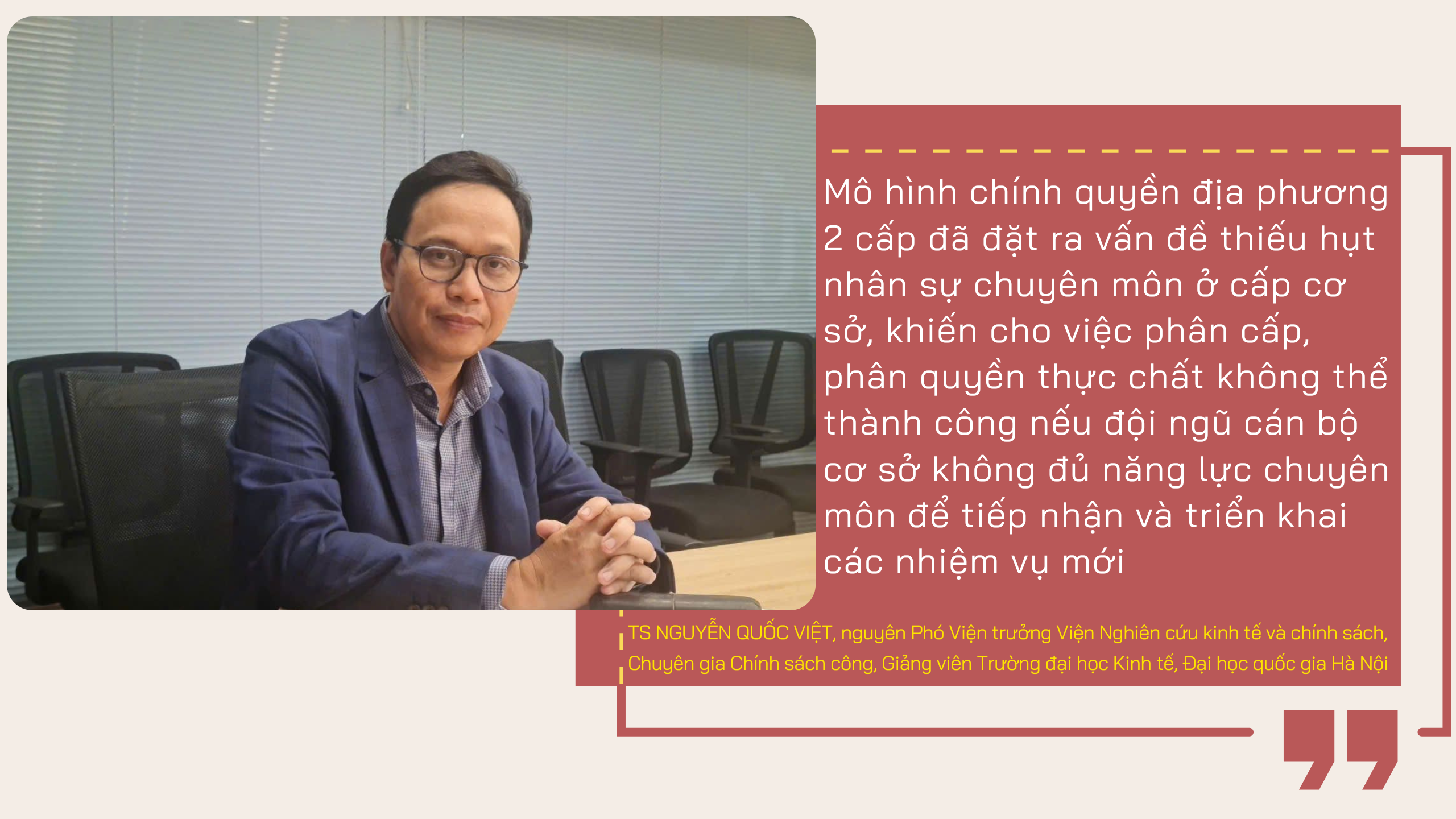 “Mô hình chính quyền địa phương 2 cấp đã đặt ra vấn đề thiếu hụt nhân sự chuyên môn ở cấp cơ sở, khiến cho việc phân cấp, phân quyền thực chất không thể thành công nếu đội ngũ cán bộ cơ sở không đủ năng lực chuyên môn để tiếp nhận và triển khai các nhiệm vụ mới”, Tiến sĩ Nguyễn Quốc Việt bày tỏ.