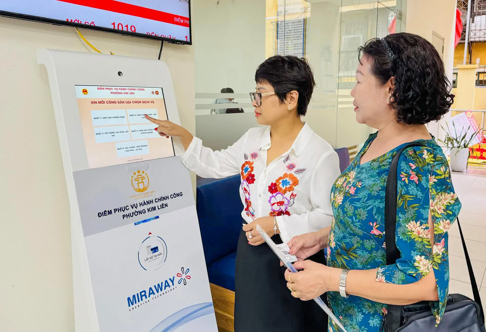 Công chức tại Điểm tiếp nhận, phục vụ hành chính công phường Kim Liên hướng dẫn người dân lấy số để thực hiện các thủ tục hành chính. Ảnh: KHÁNH HUY