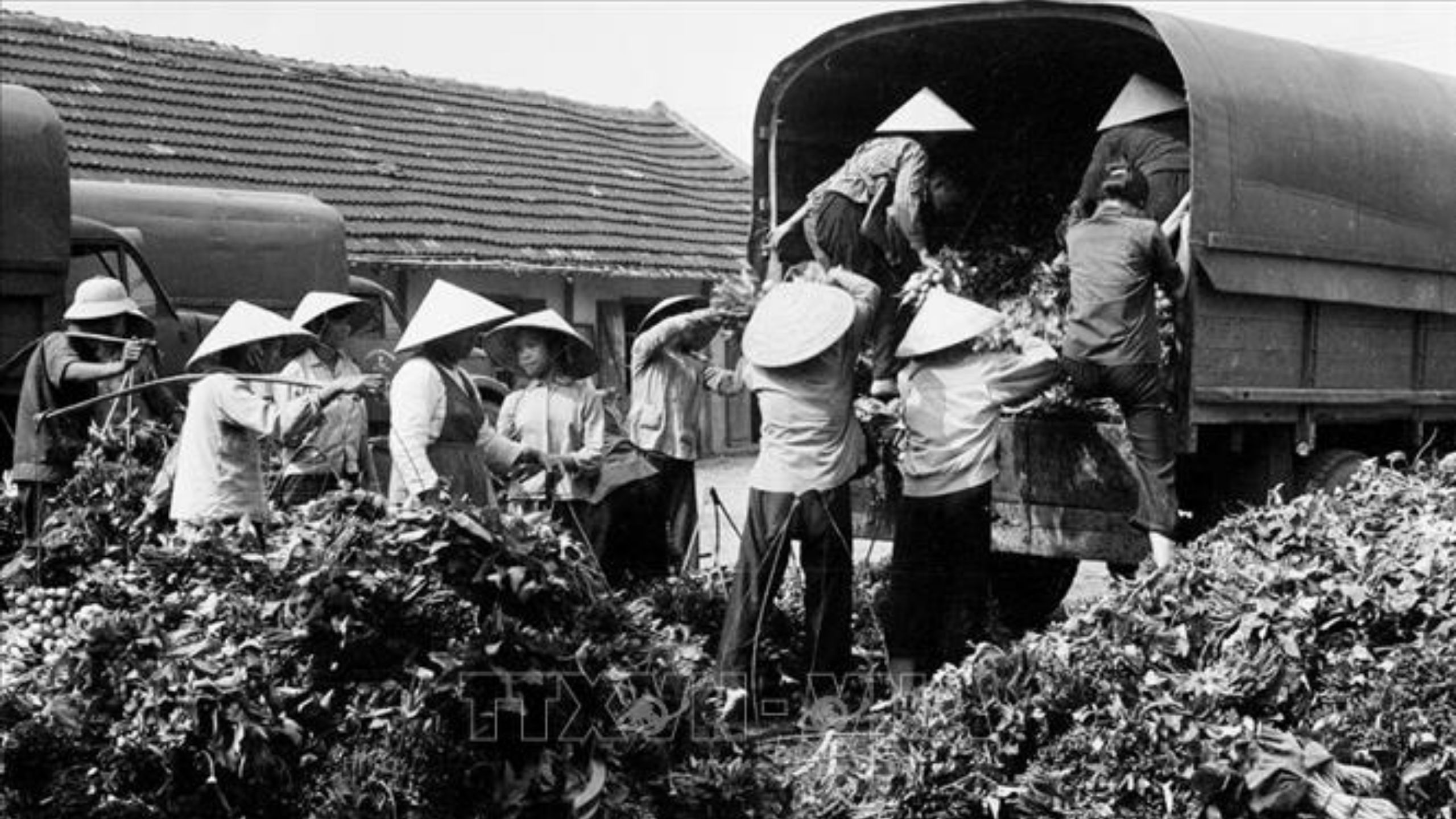 Nhân viên trạm thu mua rau Thanh Trì chuẩn bị rau để đưa đi tiêu thụ, tháng 1/1977. Ảnh: TTXVN