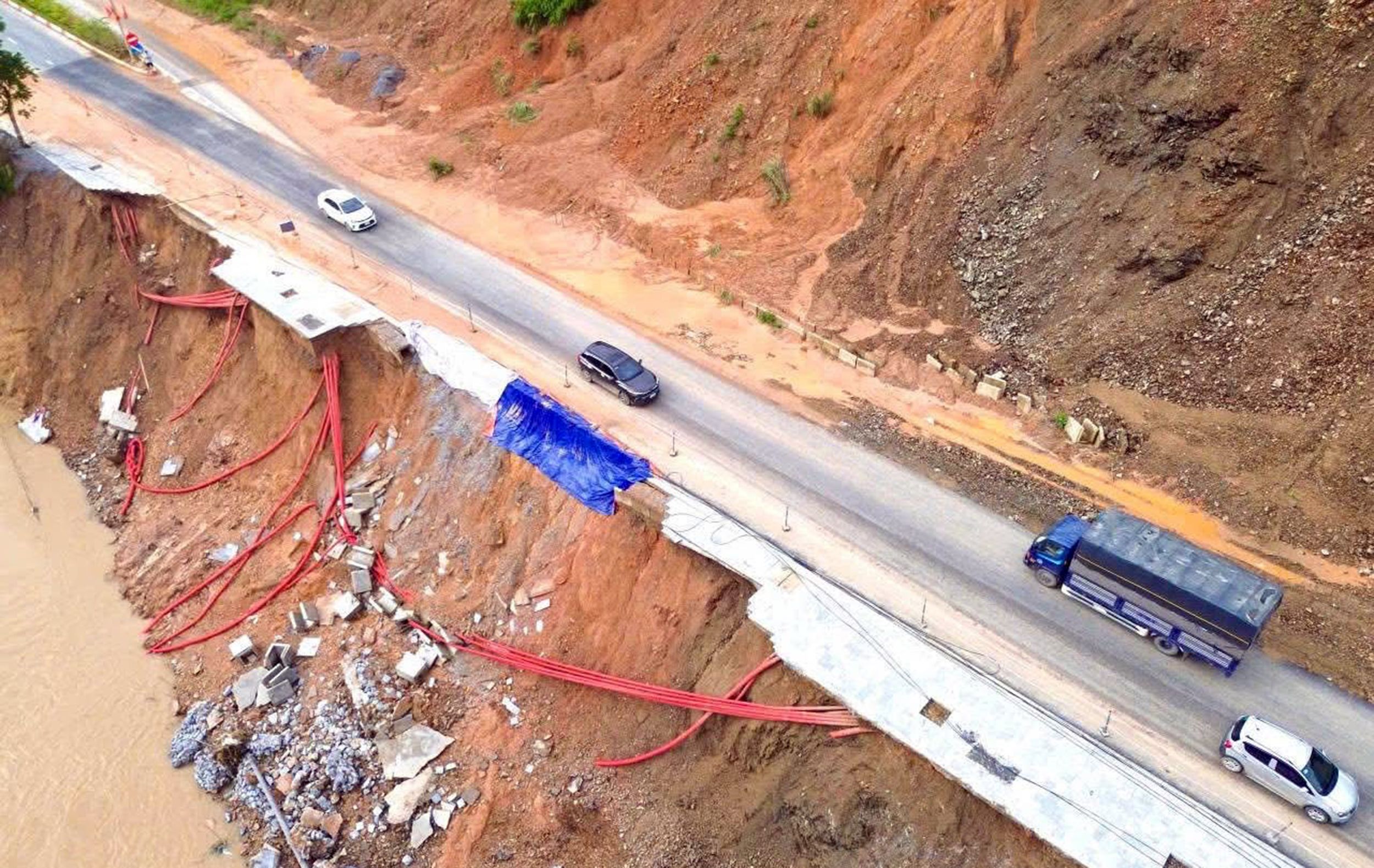 Quốc lộ 2 đoạn từ km295+995 đến km296+200 đường Hà Giang-Hà Nội bị sạt lở nghiêm trọng do mưa lũ bão số 10 gây ra. Ảnh: Đức Thắng.