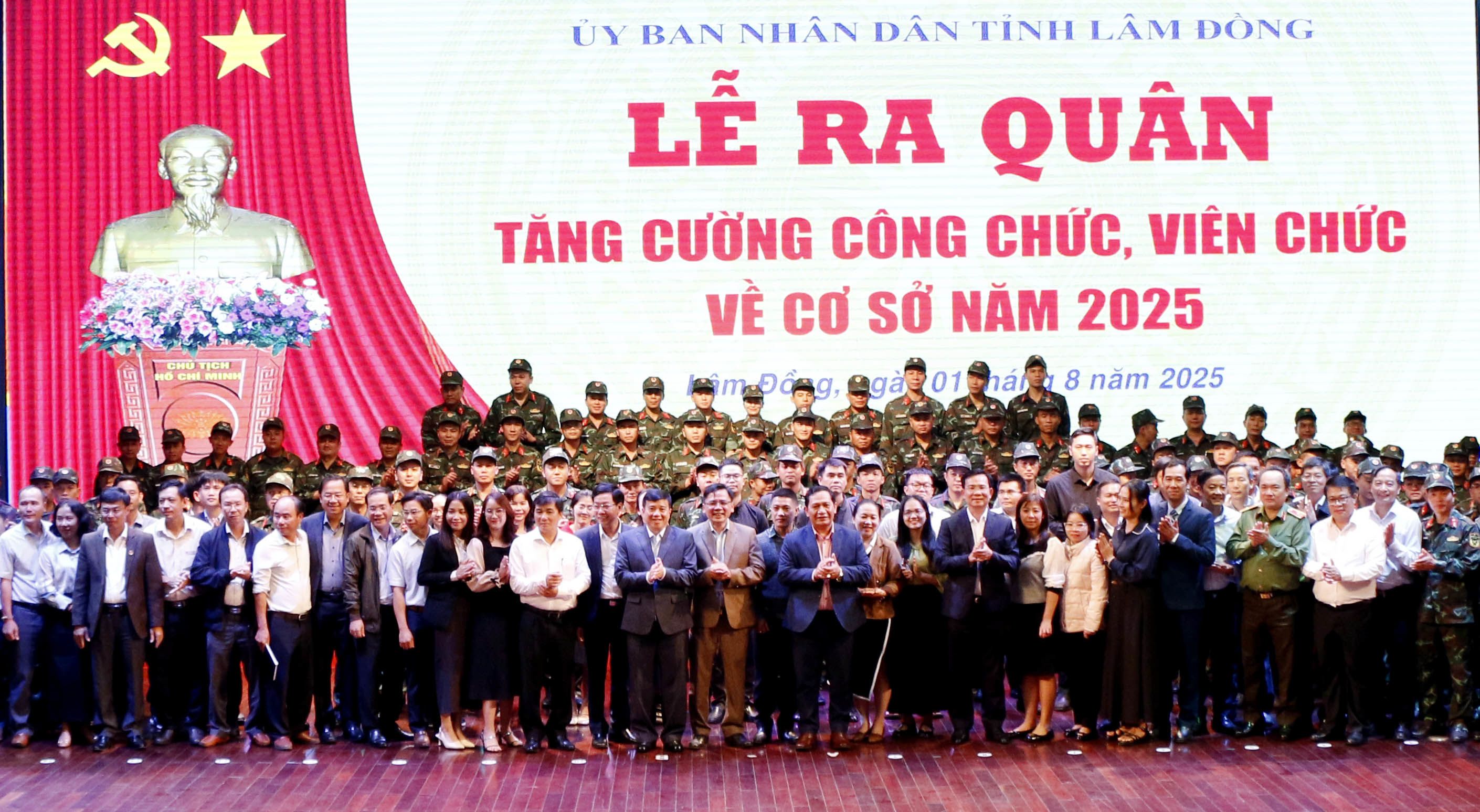 Lãnh đạo tỉnh Lâm Đồng với công chức, viên chức và chiến sĩ công an, quân đội tại lễ ra quân tăng cường về cơ sở năm 2025. Ảnh: Mai Văn Bảo.
