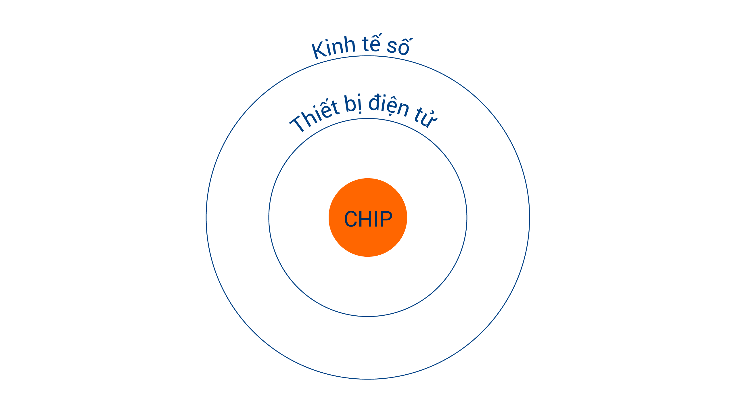 Dùng hình ảnh 3 vòng tròn đồng tâm, ông Hòa nhấn mạnh sự quan trọng của ngành chip. Theo đó, vòng tròn thứ nhất là kinh tế số, vòng tròn thứ hai là các thiết bị điện tử, lõi trong cùng – vòng tròn thứ ba là chip bán dẫn.