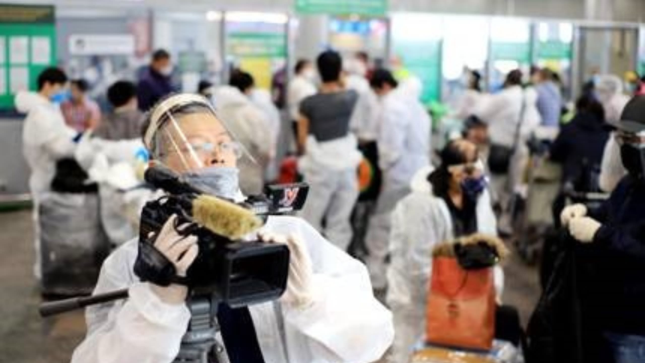 Trưởng CQTT tại Moskva Bùi Duy Trinh ghi hình sự kiện đưa hơn 300 công dân Việt Nam từ Liên bang Nga về nước tại sân bay Sherementyevo, tháng 5/2020.