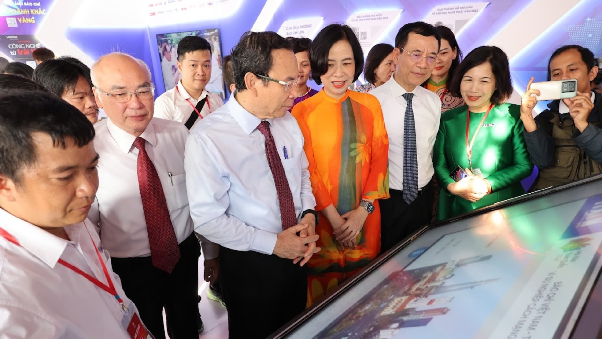 Các đại biểu tham quan gian trưng bày của TTXVN tại Hội Báo toàn quốc 2024, ngày 15/3.
