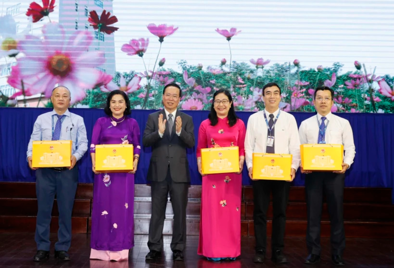 Chủ tịch nước Võ Văn Thưởng tặng quà cho các thầy cô giáo. (Ảnh: TTXVN)