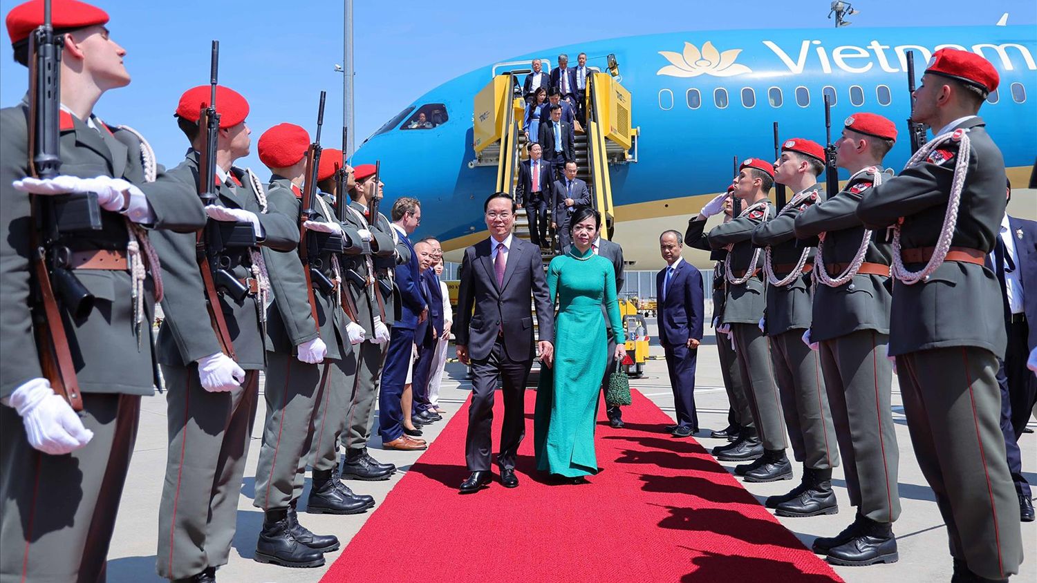 Khoảng 13 giờ 40 phút ngày 23/7 (giờ địa phương), tức khoảng 18 giờ 40 phút cùng ngày (giờ Hà Nội), Chủ tịch nước Võ Văn Thưởng và Phu nhân dẫn đầu Đoàn đại biểu cấp cao Việt Nam tới Sân bay quốc tế Vienna, bắt đầu chuyến thăm chính thức Cộng hòa Áo. (Ảnh: TTXVN)