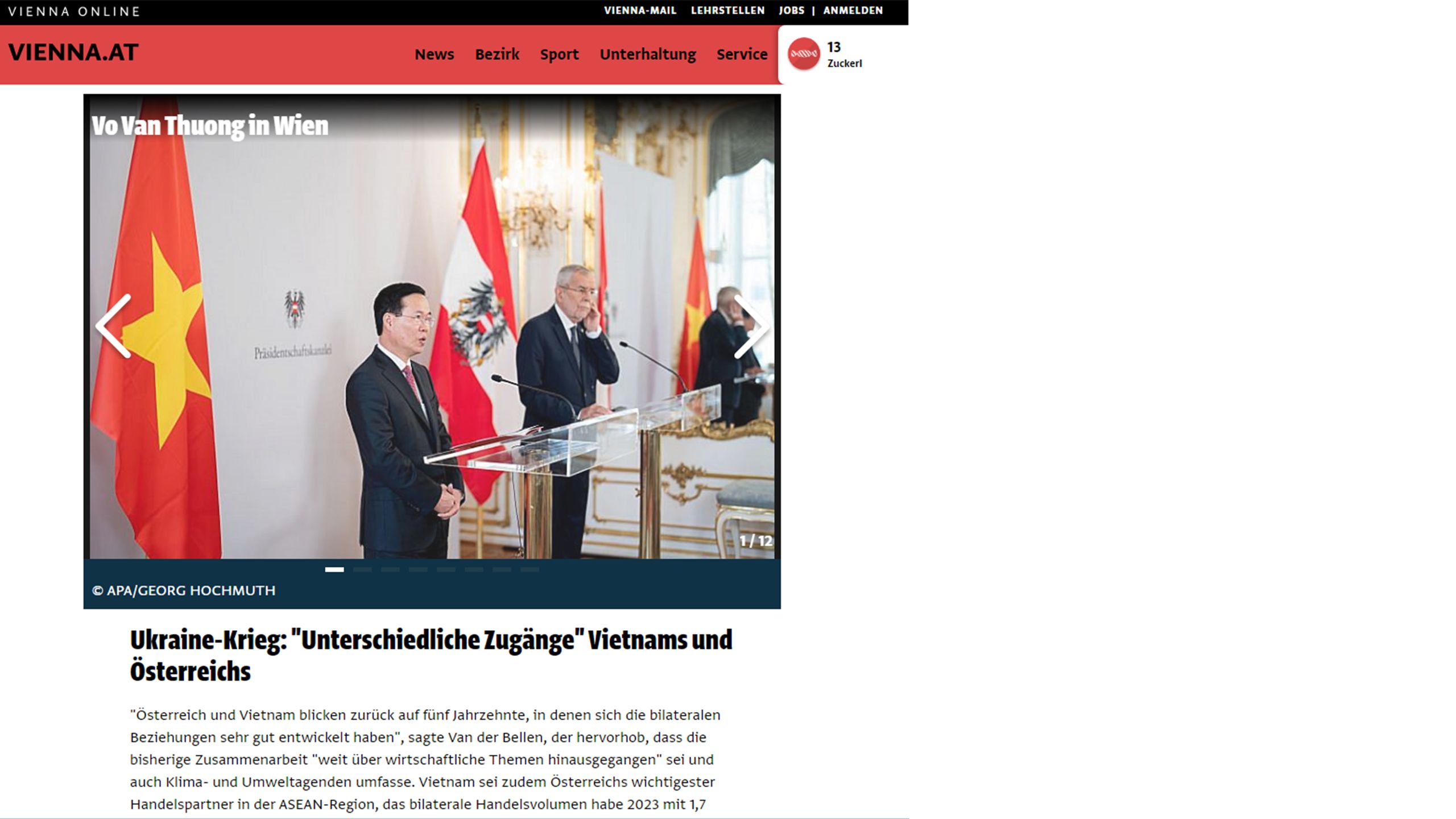 Trang Vienna.at của Áo cho biết, Tổng thống Áo Alexander Van der Bellen đã đón tiếp và hội đàm với Chủ tịch nước Võ Văn Thưởng tại Cung điện Hofburg ở thủ đô Vienna. Bài báo dẫn lời Tổng thống Áo nhấn mạnh: “Cùng nhìn lại năm thập kỷ qua, có thể thấy rằng quan hệ song phương Áo-Việt Nam đã phát triển rất tốt đẹp”.