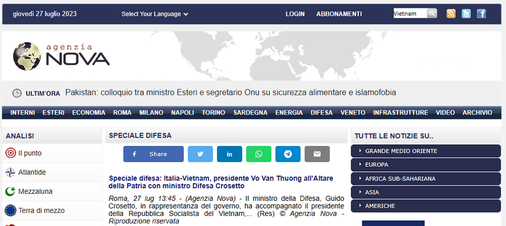 Hãng tin Agenzia Nova đăng bài viết “Chuyến thăm của Chủ tịch nước Võ Văn Thưởng thắt chặt quan hệ song phương”.