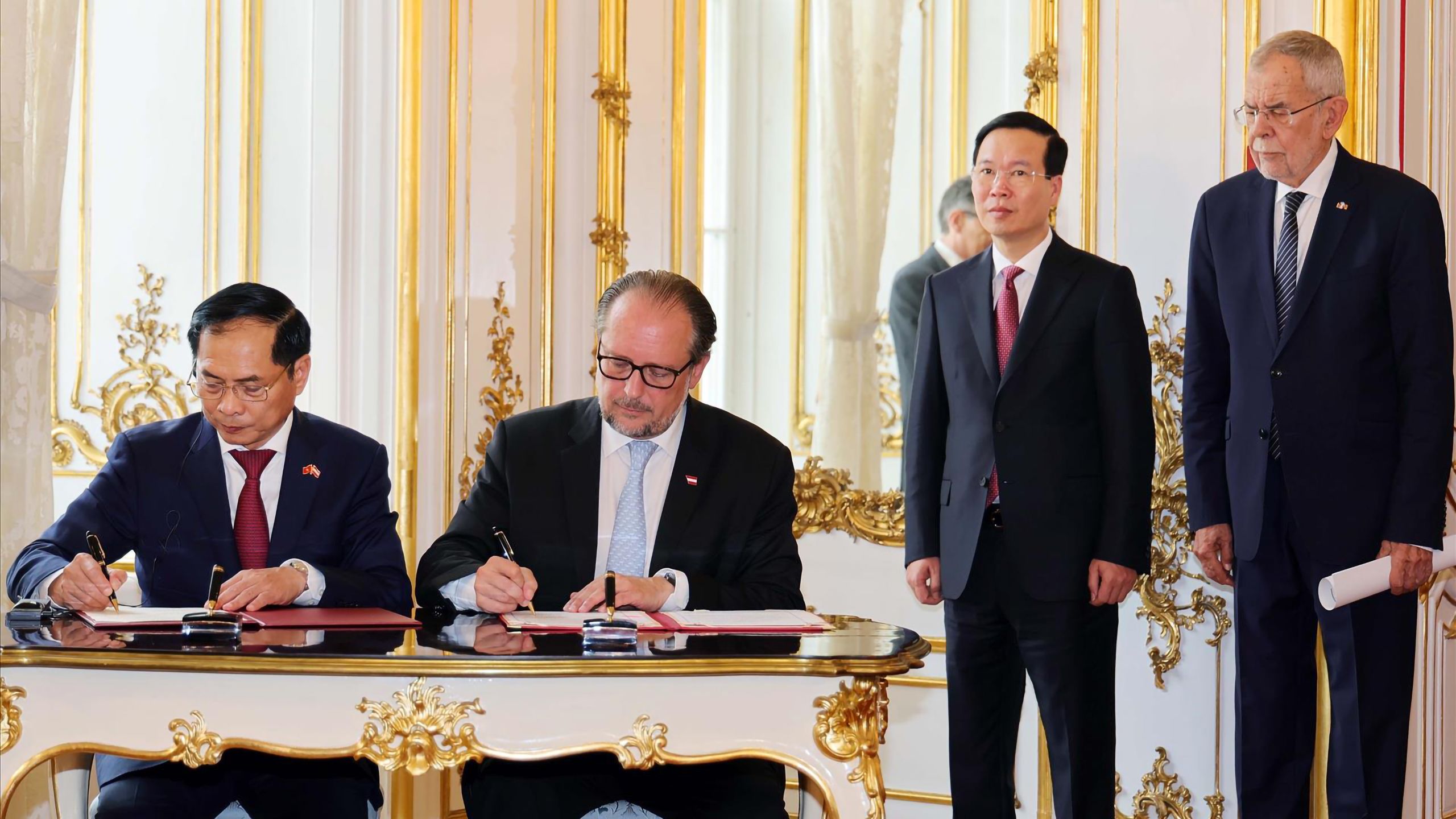 Chủ tịch nước Võ Văn Thưởng và Tổng thống Cộng hòa Áo Alexander Van der Bellen chứng kiến lễ ký kết bản ghi nhớ giữa Bộ Ngoại giao Việt Nam và Bộ Liên bang về các vấn đề châu Âu và quốc tế Áo. (Ảnh: TTXVN)