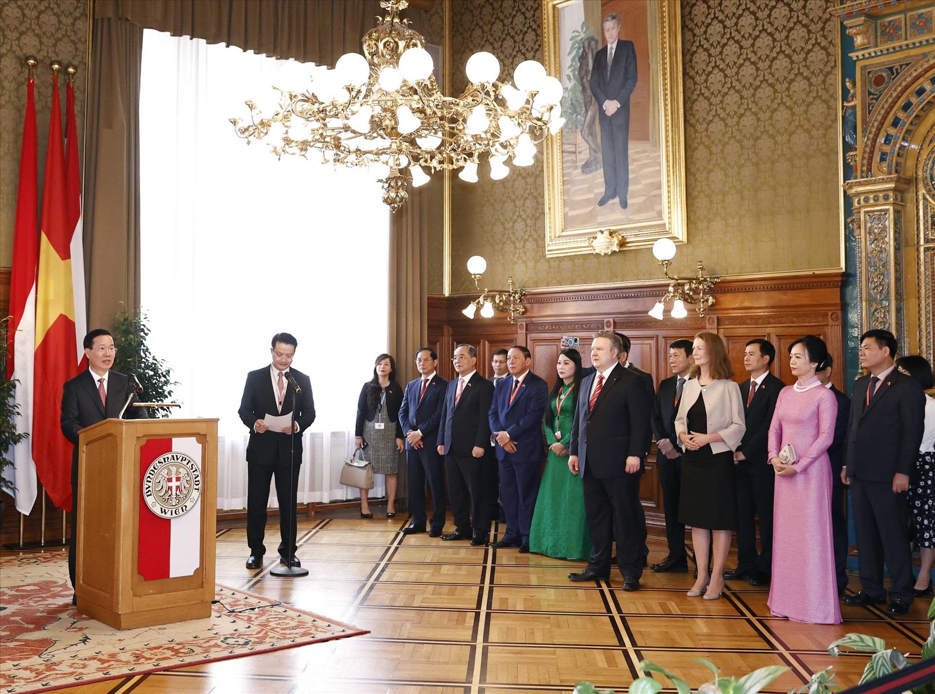 Chủ tịch nước Võ Văn Thưởng phát biểu tại cuộc gặp Thị trưởng Vienna Michael Ludwig. (Ảnh: TTXVN)