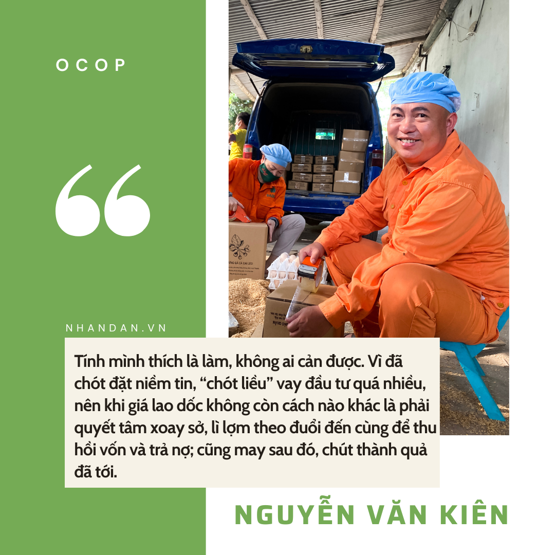 Nhớ lại khi xưa làm công ty cung cấp vi lượng cho nhà máy chăn nuôi, đưa các chuyên gia tới các nhà máy hướng dẫn cách dùng nguyên liệu cho chuẩn. Các chuyên gia đều bảo, con vật nuôi sinh sản phải chăm sóc lá gan. "Vậy thì cây cà gai quá hợp, tại sao không lấy chính cà gai để nuôi gà?", anh Kiên nghĩ.