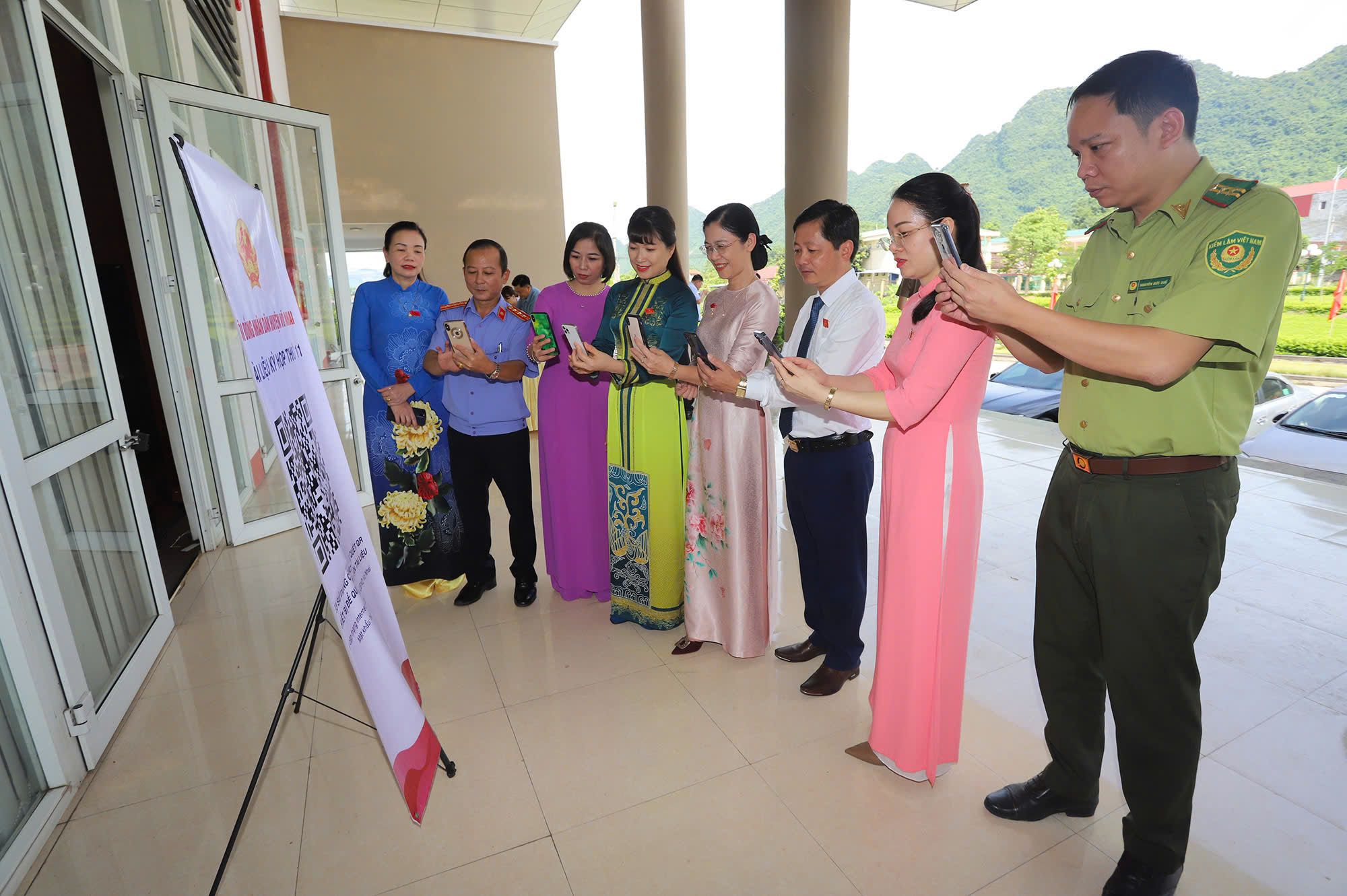Các đại biểu quét mã QR để nhận tài liệu số trong khuôn khổ kỳ họp thứ 11 Hội đồng nhân dân huyện Võ Nhai, Thái Nguyên. Ảnh: THẾ BÌNH