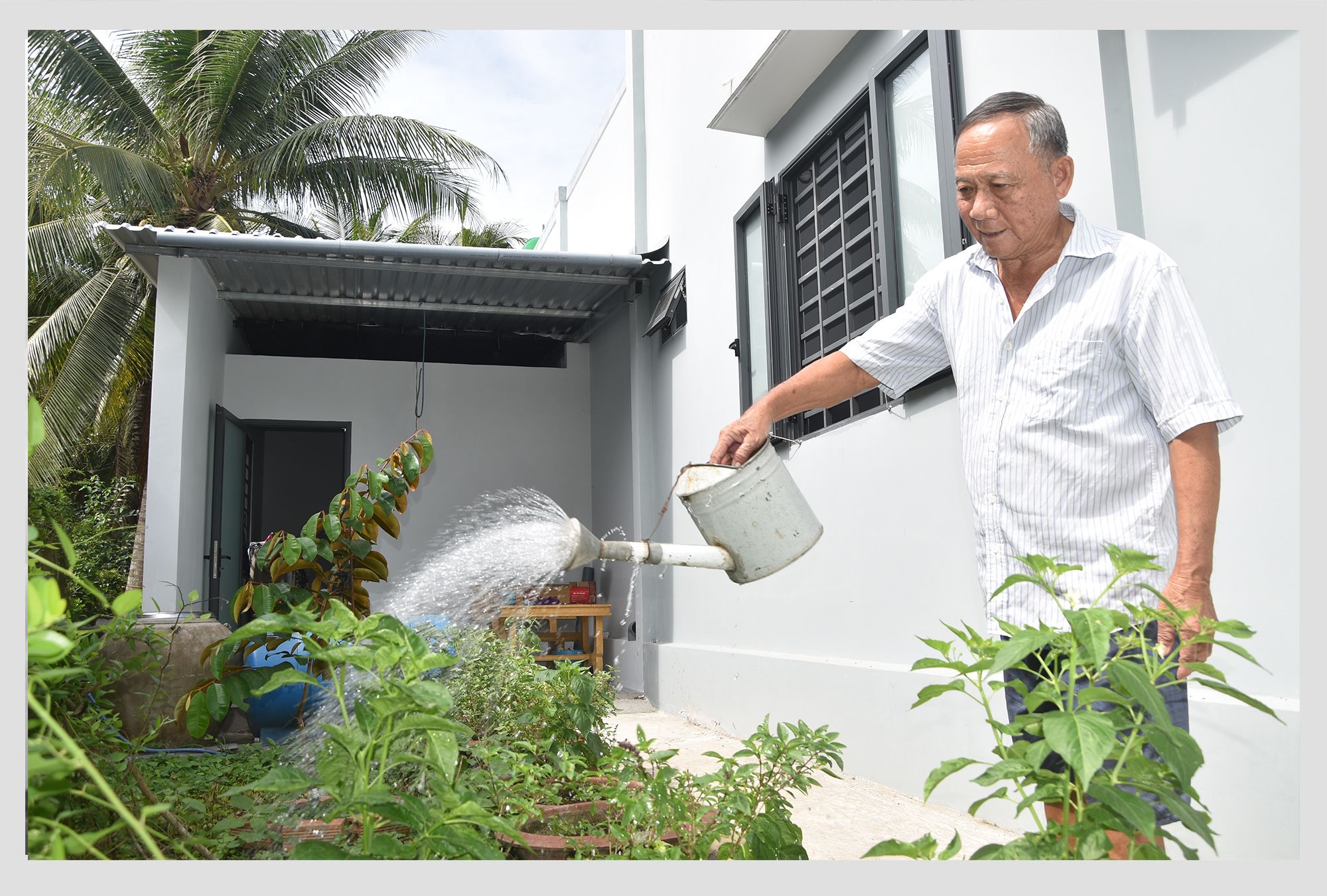 Ông Trần Văn On chăm sóc cây cối trong vườn nhà tại quê hương Tiền Giang. (Ảnh: NGUYỄN SỰ, chụp tháng 3/2025).