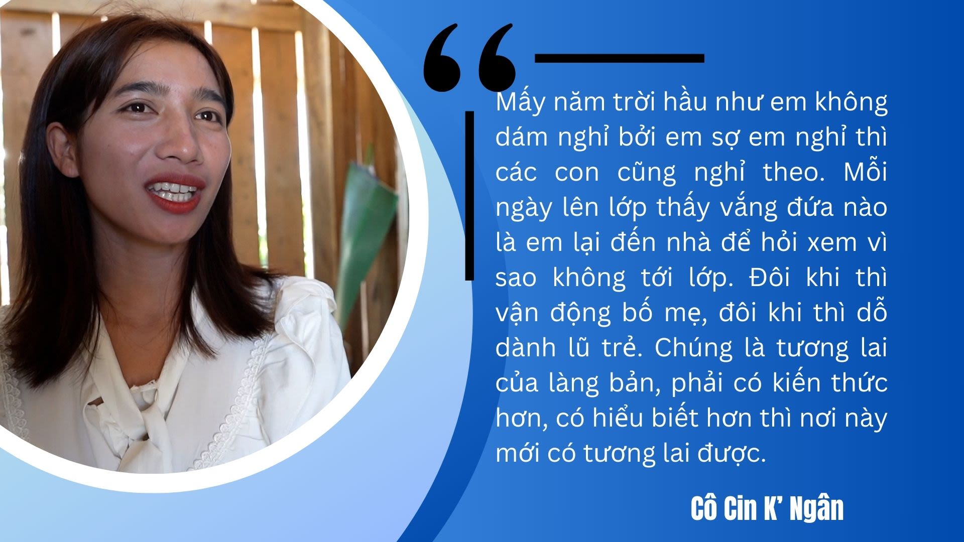 Dù mới 25 tuổi, nhưng cô Cin K’ Ngân đã dạy và công tác tại điểm trường trong nhiều năm. Cô nhớ mặt, nhớ tên từng em học sinh và thấu hiểu hoàn cảnh của từng gia đình. Mỗi tuần, cô sẽ mất khoảng 6 tiếng đồng hồ để vượt những con đường hiểm dốc: mùa mưa thì sình lầy, trơn trượt; mùa khô thì bụi bay mịt mù để ra vào tiểu khu.