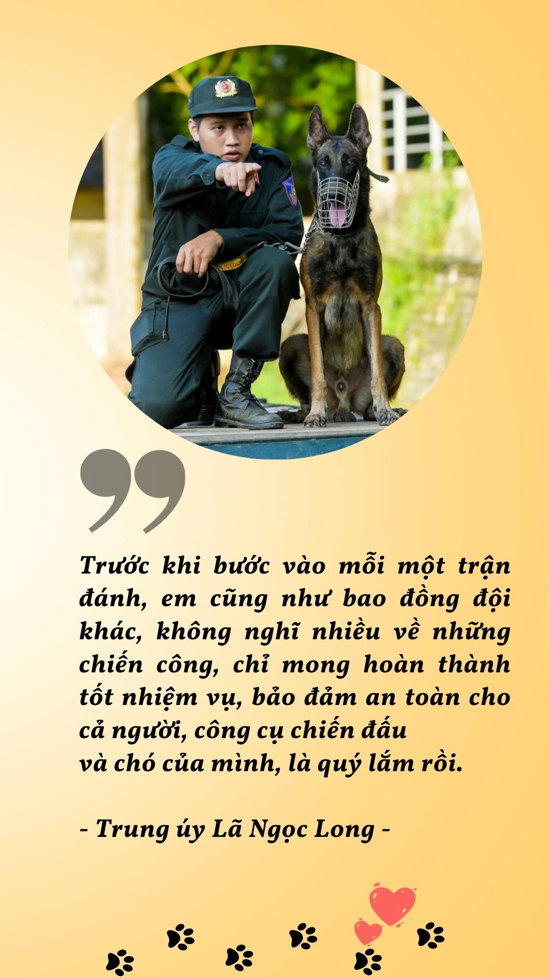 Nói về những chiến công của mình cùng Alex, Lã Ngọc Long giọng trầm xuống: "Trước khi bước vào mỗi một trận đánh, em cũng như bao đồng đội khác, không nghĩ nhiều về những chiến công, chỉ mong hoàn thành tốt nhiệm vụ, bảo đảm an toàn cho cả người, công cụ chiến đấu và chó của mình, là quý lắm rồi".