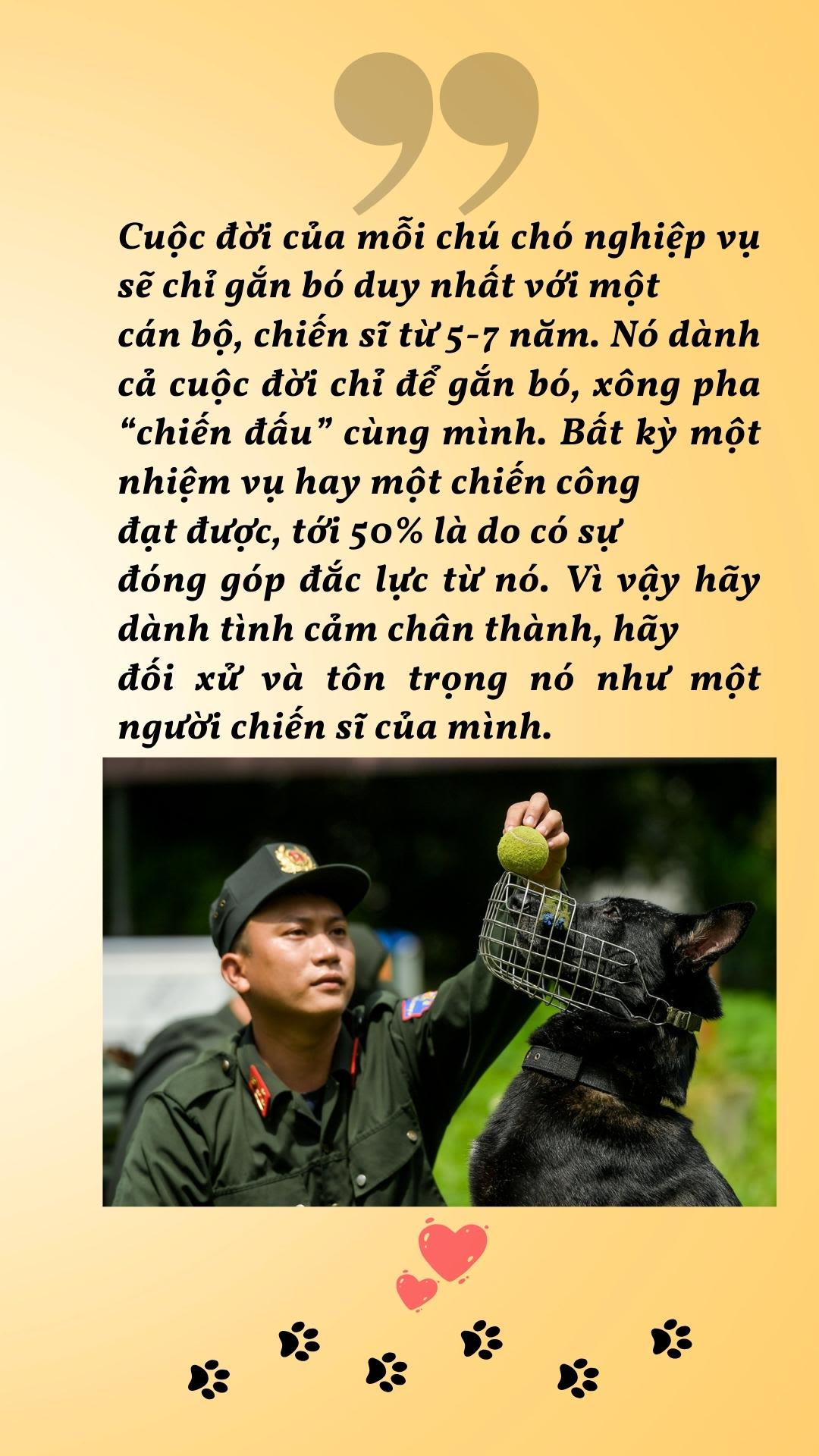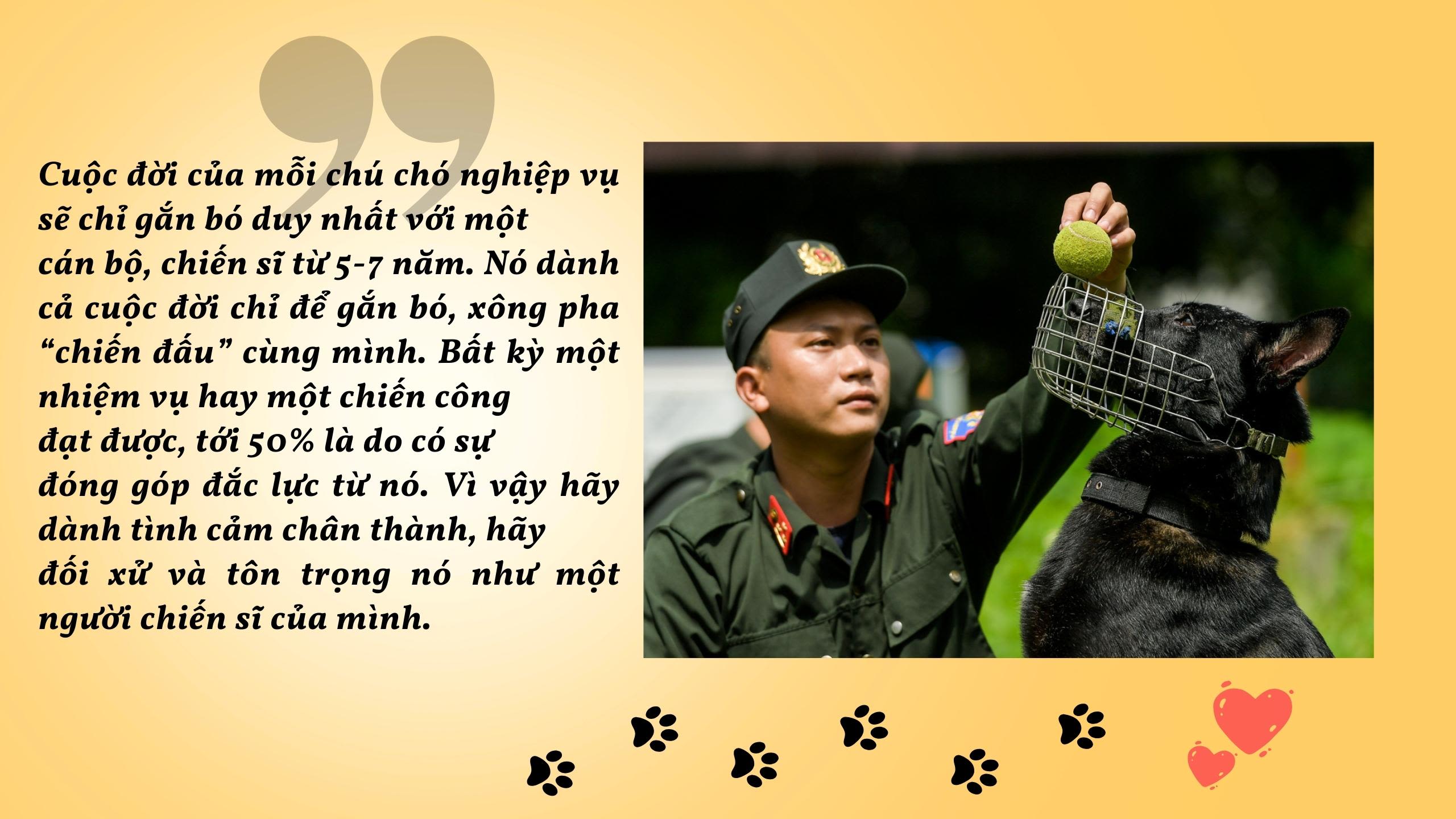 Nếu ngày nghỉ hay mỗi đợt nghỉ phép, vừa về đến nhà mà nghe cán bộ thú y thông báo chó của mình ốm, là em lại tức tốc quay trở lại đơn vị để cùng bác sĩ thú y chăm cho đến khi nó khỏe mạnh mới yên tâm. Tối cũng ngủ lại bệnh xá để chăm sóc nó….".