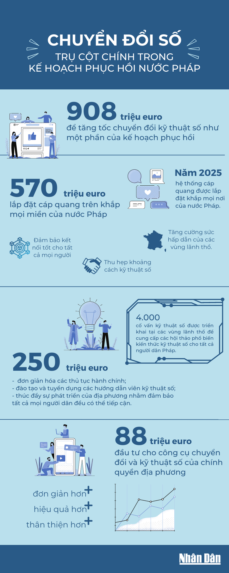 Gần 7 tỷ euro được cam kết trong giai đoạn 2020-2022. Bốn trụ cột chính mà kế hoạch chuyển đổi số tại Pháp trong thời gian này hướng tới, đó là: