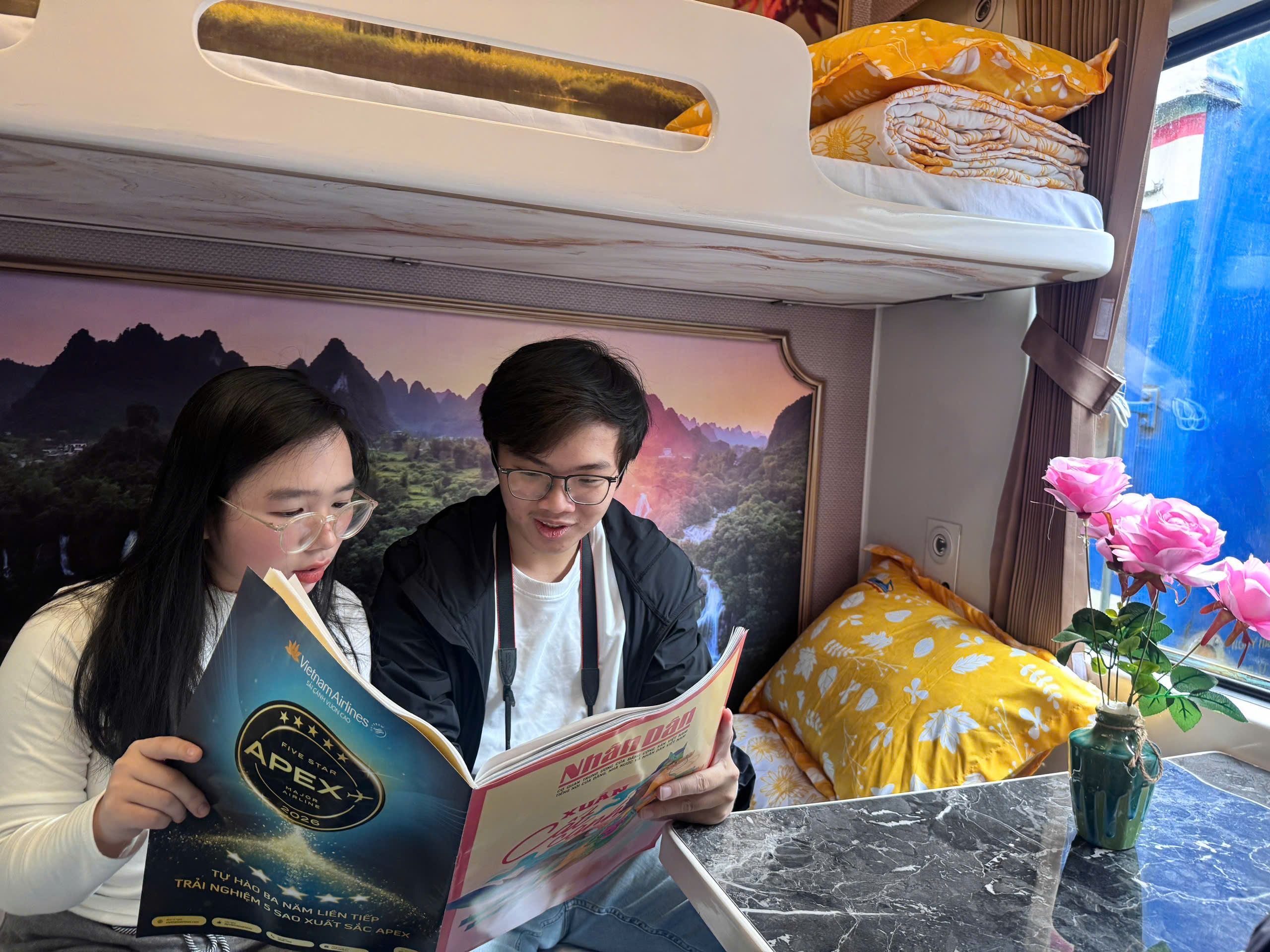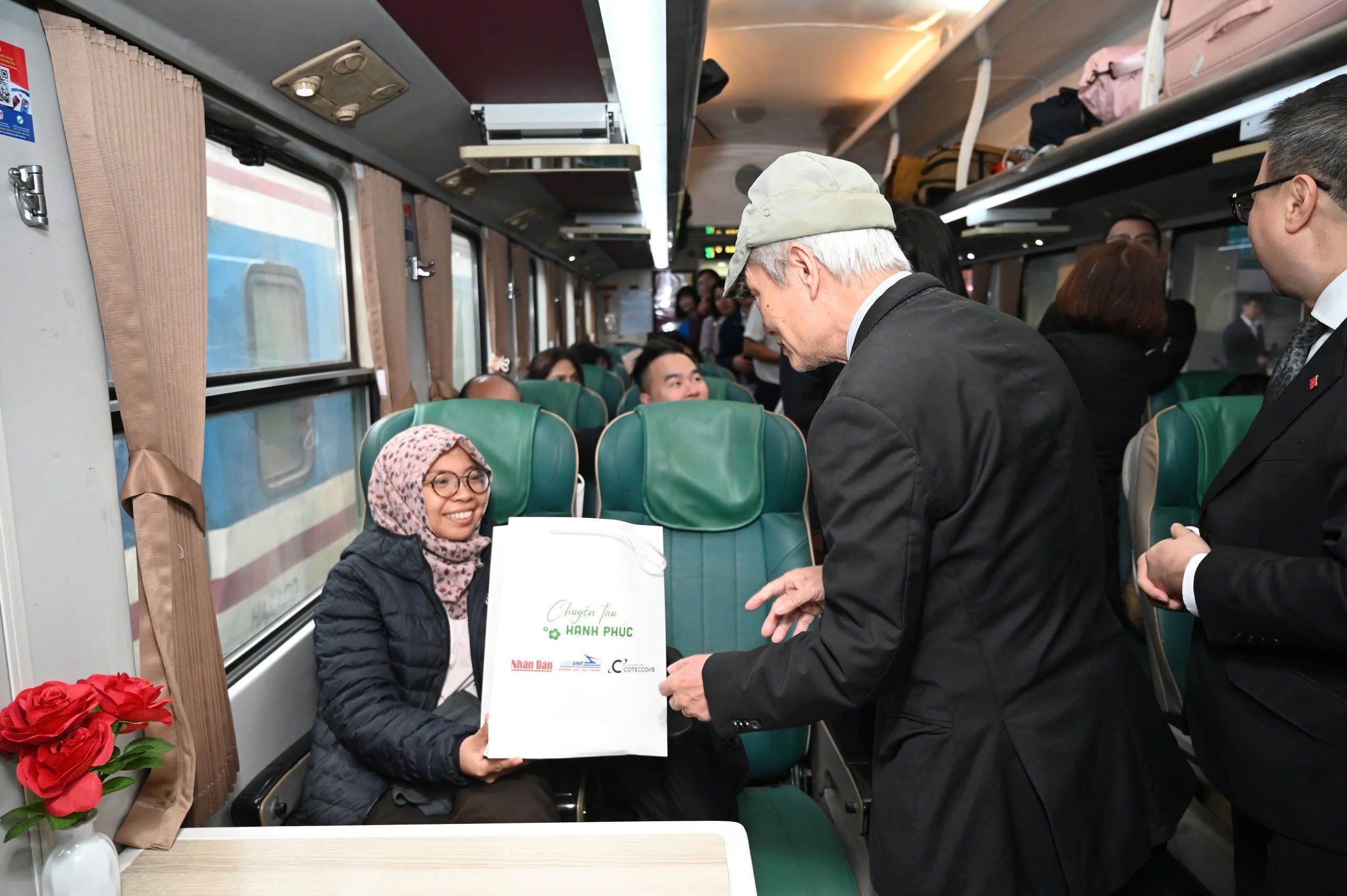 Có hành khách gửi lời chúc năm mới giản dị. Có những người lặng lẽ đọc Báo Nhân Dân trên tàu. Có những ánh mắt nhìn ra cửa sổ, nơi đất nước đang trôi qua theo từng nhịp bánh sắt.