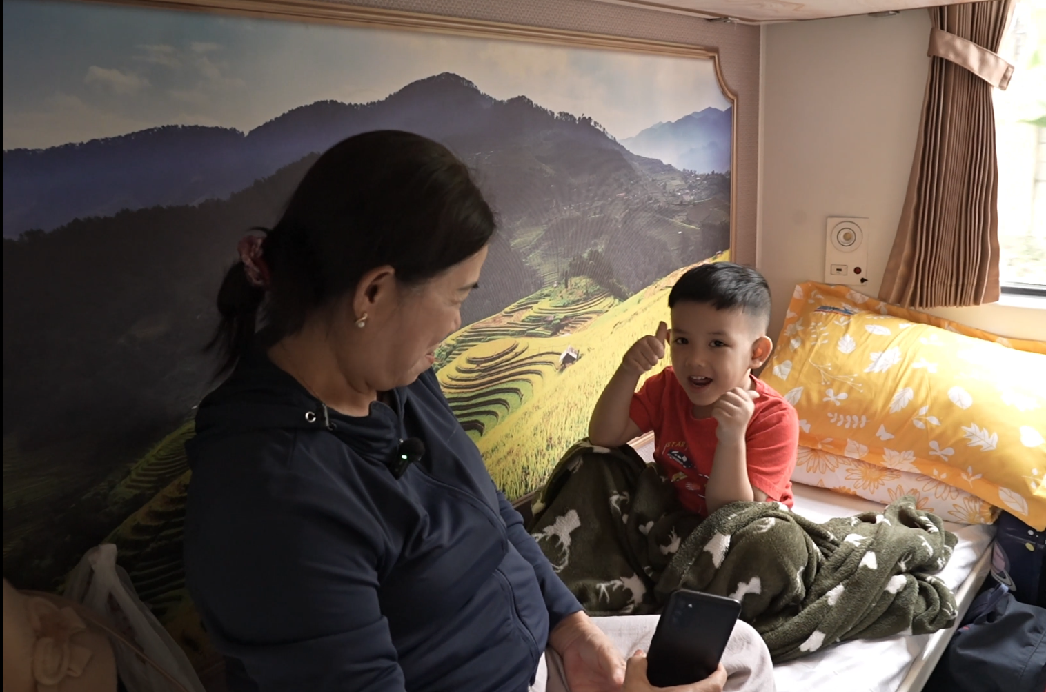 Trên chuyến tàu ấy, có một người bà dắt theo cháu nhỏ. Nhìn quanh toa tàu rực rỡ sắc xuân, bà cười hiền: