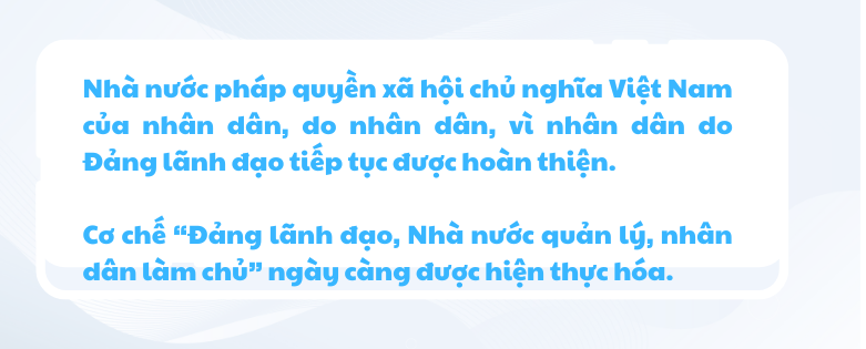 Nhà nước pháp quyền xã hội chủ nghĩa Việt Nam của nhân dân, do nhân dân, vì nhân dân do Đảng lãnh đạo tiếp tục được hoàn thiện. Thực hiện nhất quán nguyên tắc tất cả quyền lực nhà nước thuộc về nhân dân; quyền lực nhà nước là thống nhất, có sự phân công rành mạch, phối hợp chặt chẽ, kiểm soát hiệu quả giữa các cơ quan nhà nước trong việc thực hiện các quyền lập pháp, hành pháp, tư pháp dưới sự giám sát của nhân dân. Cơ chế “Đảng lãnh đạo, Nhà nước quản lý, nhân dân làm chủ” ngày càng được hiện thực hóa.
